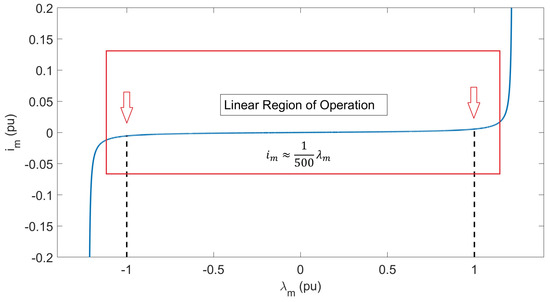 Figure 3 demonstrates that as long as the magnetic core flux of the transformer is prevented from saturating, it operates linearly. Within the linearized (unsaturated) region, the ratio between i m and λ m is approximately 1 / 500 , indicating that L m 500 H [11], where L m represents the linearized inductance of the transformer core.