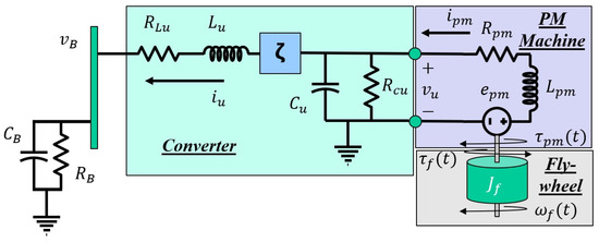 In Figure 4, ω f represents the flywheel angular velocity, τ f denotes the torque due to bearing friction in the flywheel, τ p m is the torque produced by the PM machine, v u is the voltage output from the PM machine, i p m is the current output by the PM machine, i u is the current output from the converter, ζ is the variable converter ratio, and v B is the bus voltage that is fed into Figure 2 through the u n term. The remaining parameters for the flywheel are summarized in Table 1.