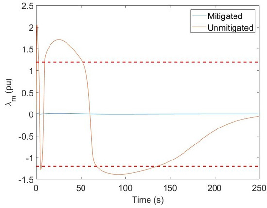 Figure 6. Transformer magnetic core flux in per unit (pu). The red dashed lines indicate the saturation limits of the transformer core ( ± 1.2 pu ). Both the mitigated and unmitigated system responses are shown in this plot for a better comparison.
