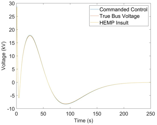 Figure 7. Required control effort to implement the Hamiltonian control law, compared to the HEMP insult voltage on the connected transmission line.