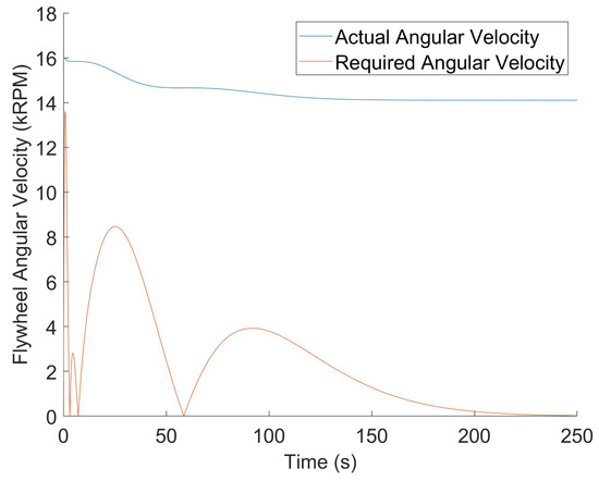 Figure 13. Angular velocity of the flywheel over time compared to the required flywheel angular velocity to maintain the commanded u n ( t ) .