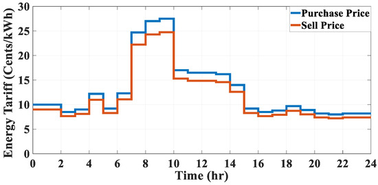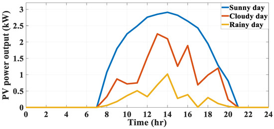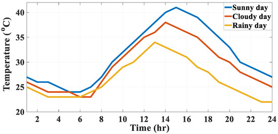 Figure 2 illustrates the purchased and sold prices of energy over 24 h. The energy generation power of the PV system for various types of days, including sunny, cloudy, and rainy days, is displayed in Figure 3. The outdoor temperature for various kinds of days, such as sunny, cloudy, and rainy days, is depicted in Figure 4.