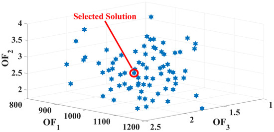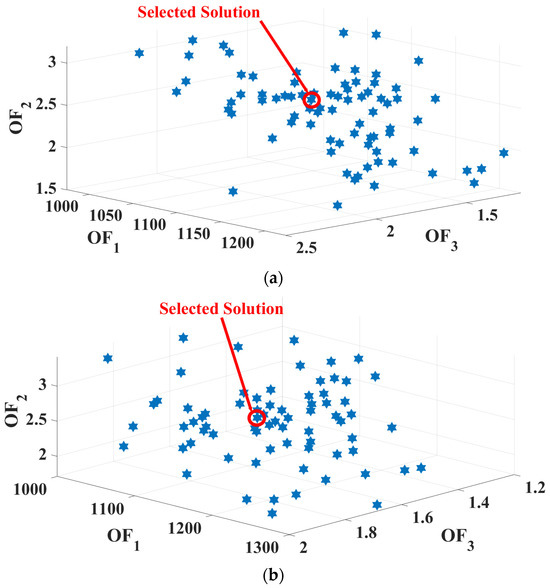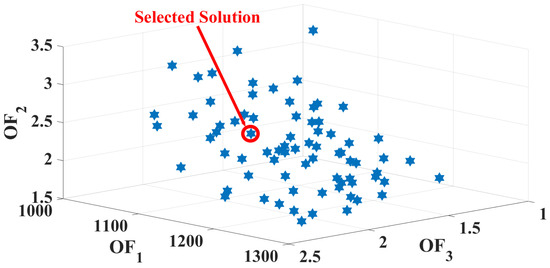 To solve the proposed multi-objective optimization problem, an improved multi-objective gray wolf optimizer with Pareto front [24] is applied, whose performance in solving the optimization problem is confirmed in [24], in comparison to other well-known optimization algorithms like the gray wolf optimizer, and another improvement in the gray wolf optimizer [32]. Another reason to select a metaheuristic optimization algorithm is that the second objective function—PAR—is non-linear. The evaluations are carried out in the MATLAB Software Package 2024a, and the program runs on Intel(R) Core(TM) i5-1335U 1.30 GHz with 32 GB RAM, running Windows 11 Pro.