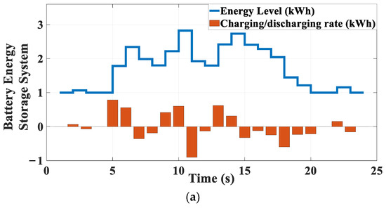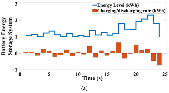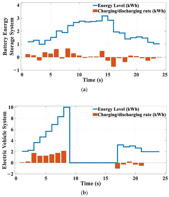 Results of the proposed SHEMS for efficiencies of ESS and EV equal to 0.9 for the selected solution that are specified in Figure 11a: (a) Charging/discharging rate and energy level of ESS; (b) Charging/discharging rate and energy level of EV.