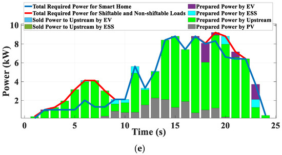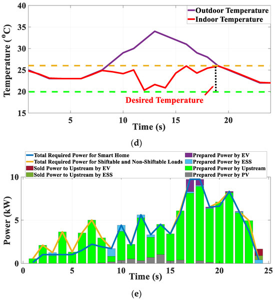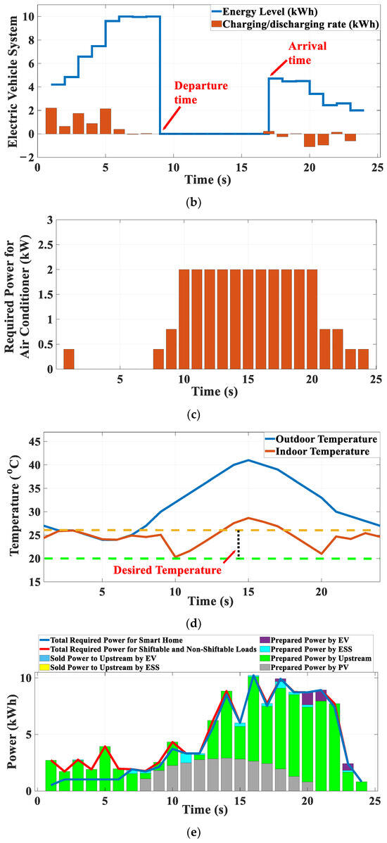 Results of proposed SHEMS during a sunny day for the selected solution that are specified in Figure 5: (a) Charging/discharging rate and energy level of ESS; (b) Charging/discharging rate and energy level of EV; (c) Required power of IBACS; (d) The daily indoor temperature control by IBACS; (e) Hourly scheduled power.