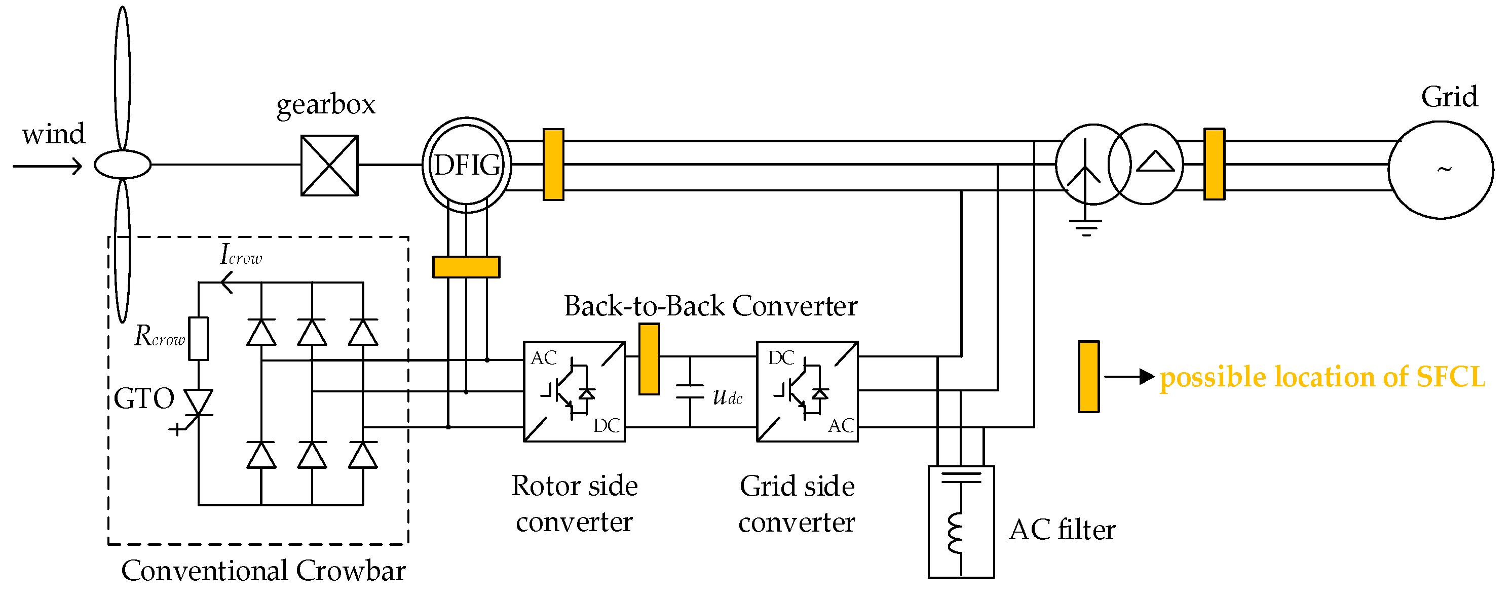 - Naderi, S.B.; Davari, P.; Zhou, D.; Negnevitsky, M.; Blaabjerg, F. A Review on Fault Current Limiting Devices to Enhance the Fault Ride-Through Capability of the Doubly-Fed Induction Generator Based Wind Turbine. Appl. Sci. 2018, 8, 2059. [Google Scholar] [CrossRef]