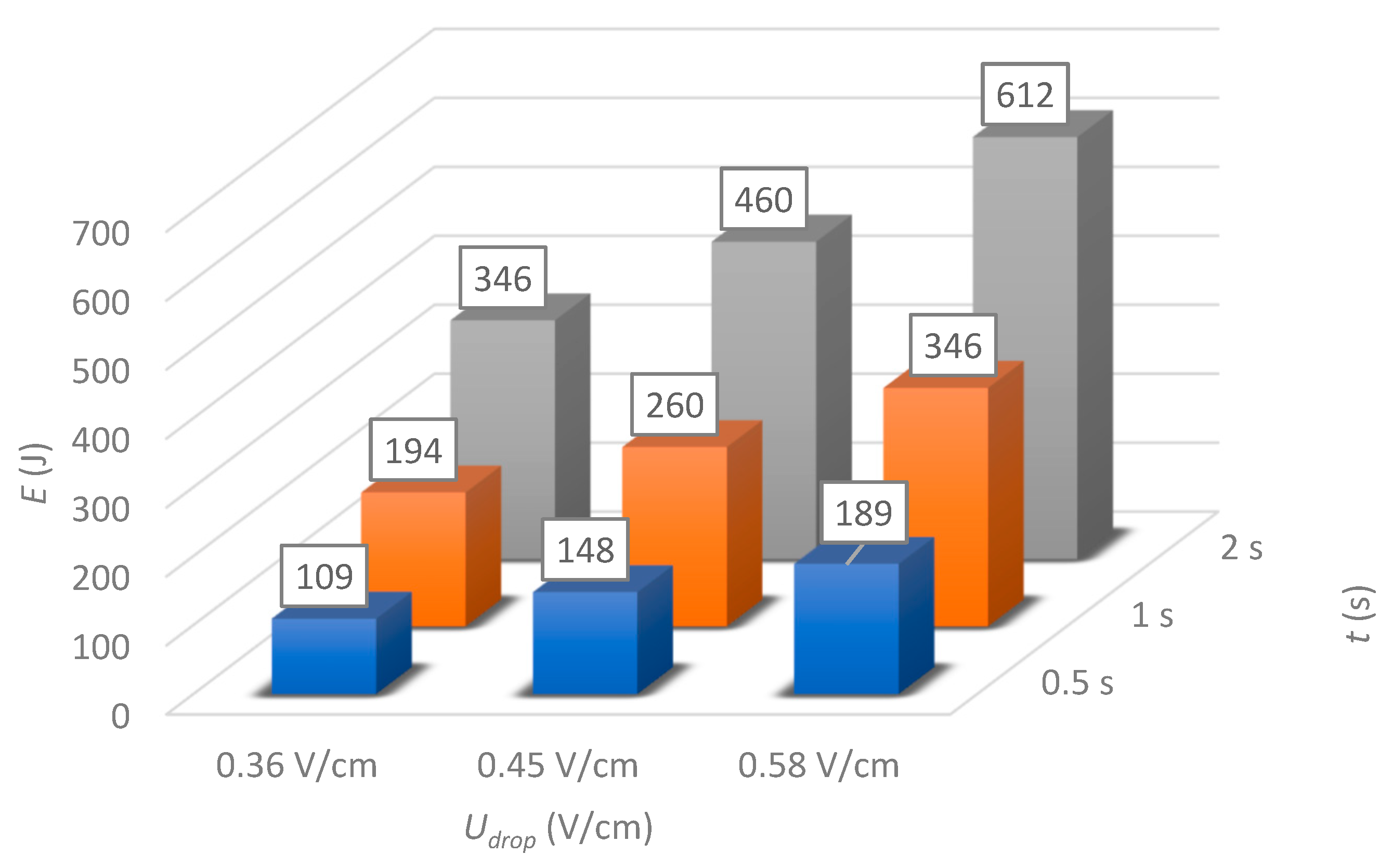 t (s) | Udrop = 0.36 V/cm | Udrop = 0.45 V/cm | Udrop = 0.58 V/cm | |||||||||