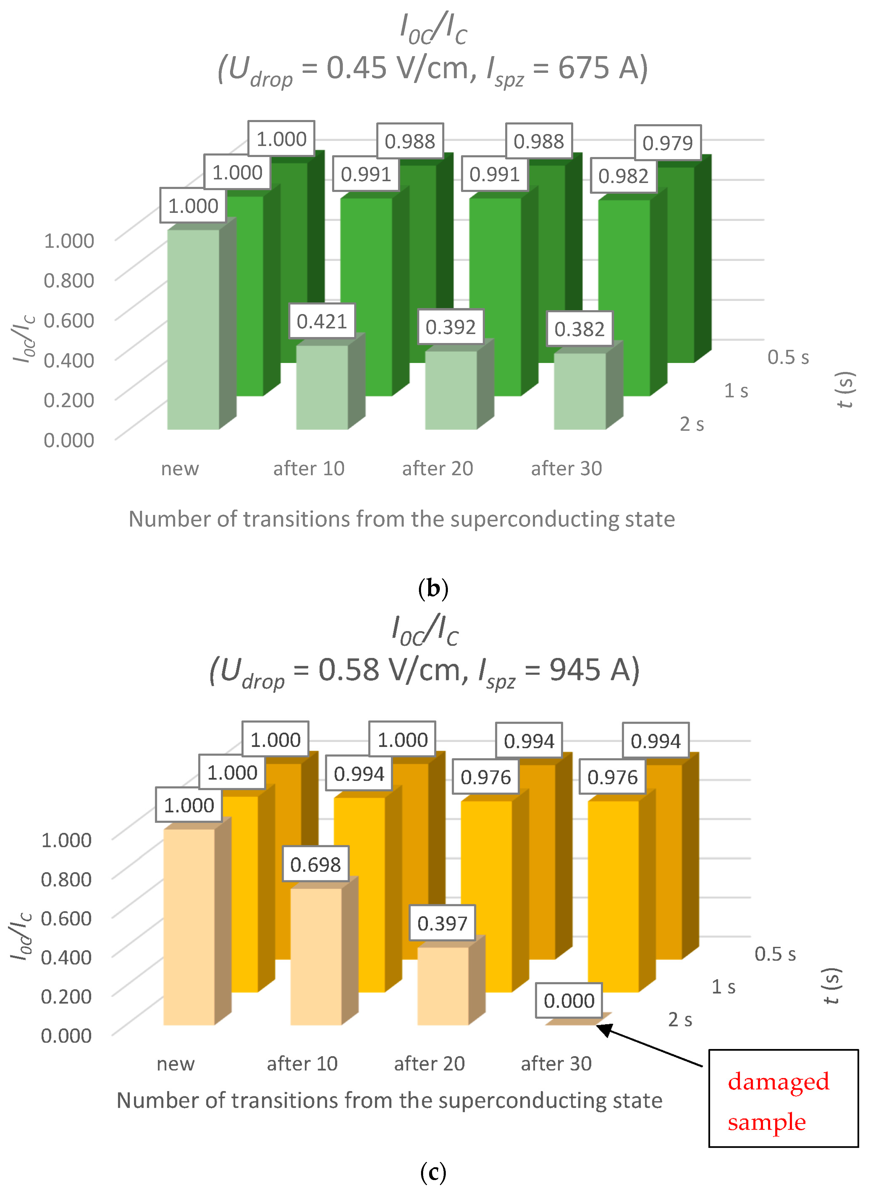 - The operating time of the SFCL in the resistive state constitutes a key functional limitation of the device. The tested HTS tapes exhibit resistance to multiple transitions from the superconducting to the resistive state, provided that the duration of the short-circuit current does not exceed approximately 1 s—note that this time corresponds to the SF12100-CF tape with a thin layer of Ag; for other tape constructions, the safe time must be determined separately. Exceeding this time results in degradation of the critical current value (IC), which may consequently lead to accelerated activation of the SFCL (at lower short-circuit currents) or permanent damage to the tape.