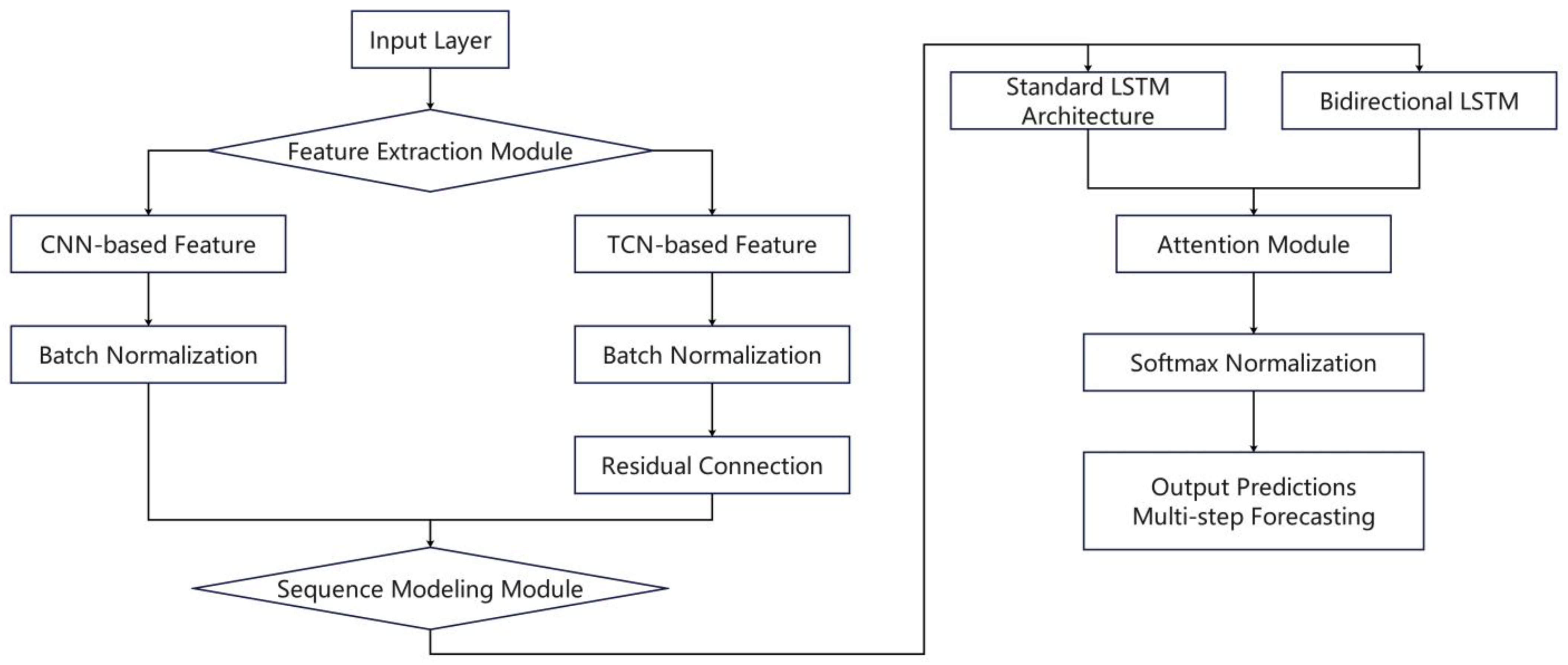 TCN-LSTM-Attention. Temporal Convolutional Networks (TCNs) offer efficient long-sequence modeling through dilated causal convolutions and residual connections. In this hybrid design, TCN layers are employed to ensure temporal causality while expanding the receptive field, thereby capturing multi-scale dependencies within the input series. The extracted features are subsequently passed into LSTM layers for refined long-term dependency modeling. The attention module adaptively highlights critical time steps, improving both predictive accuracy and interpretability.