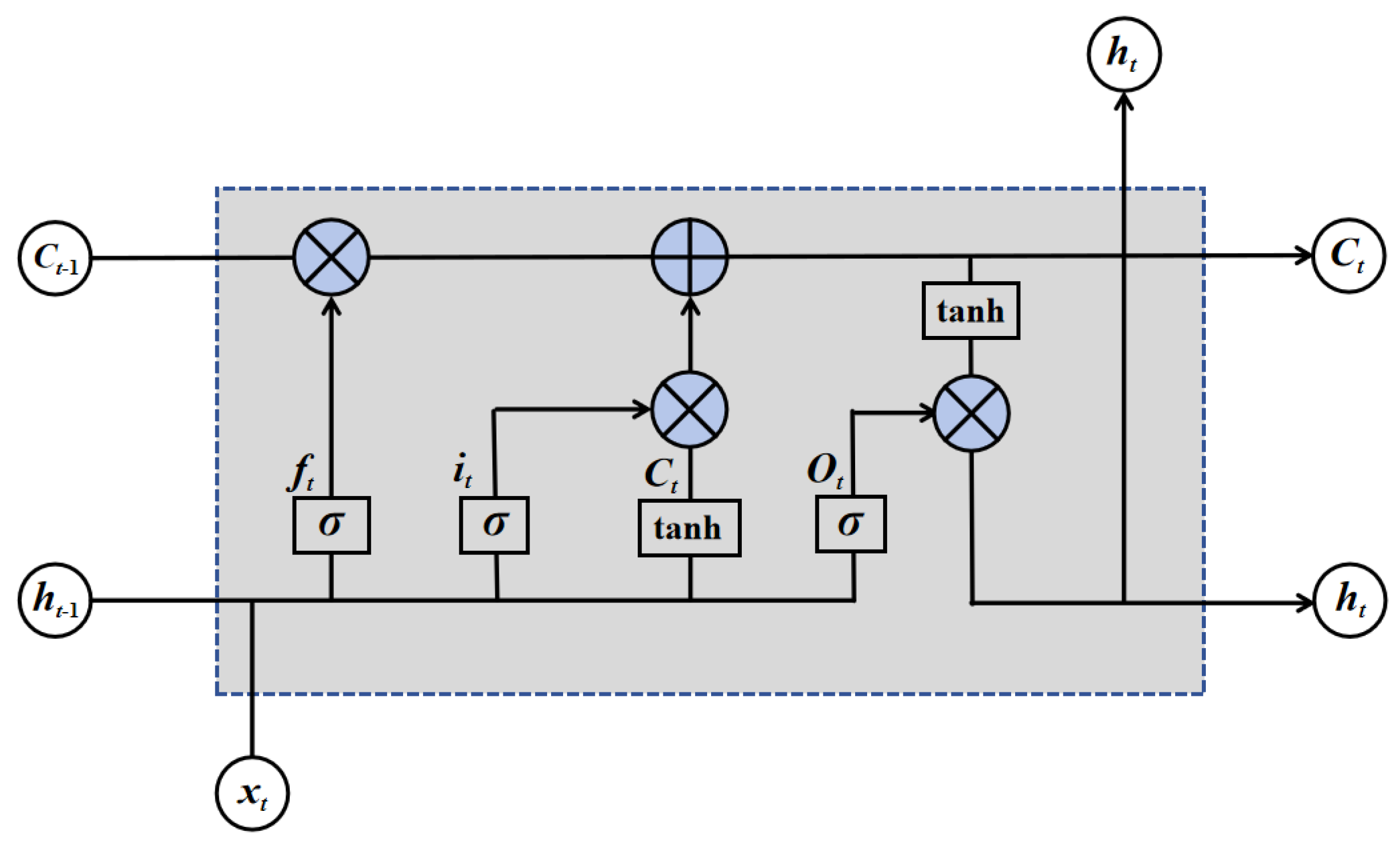 41]. From a secure network perspective, LSTM neurons consist of both internal and external components. Therefore, attention should not be focused solely on the neuron’s output but also on its internal structure. The schematic diagram is shown in