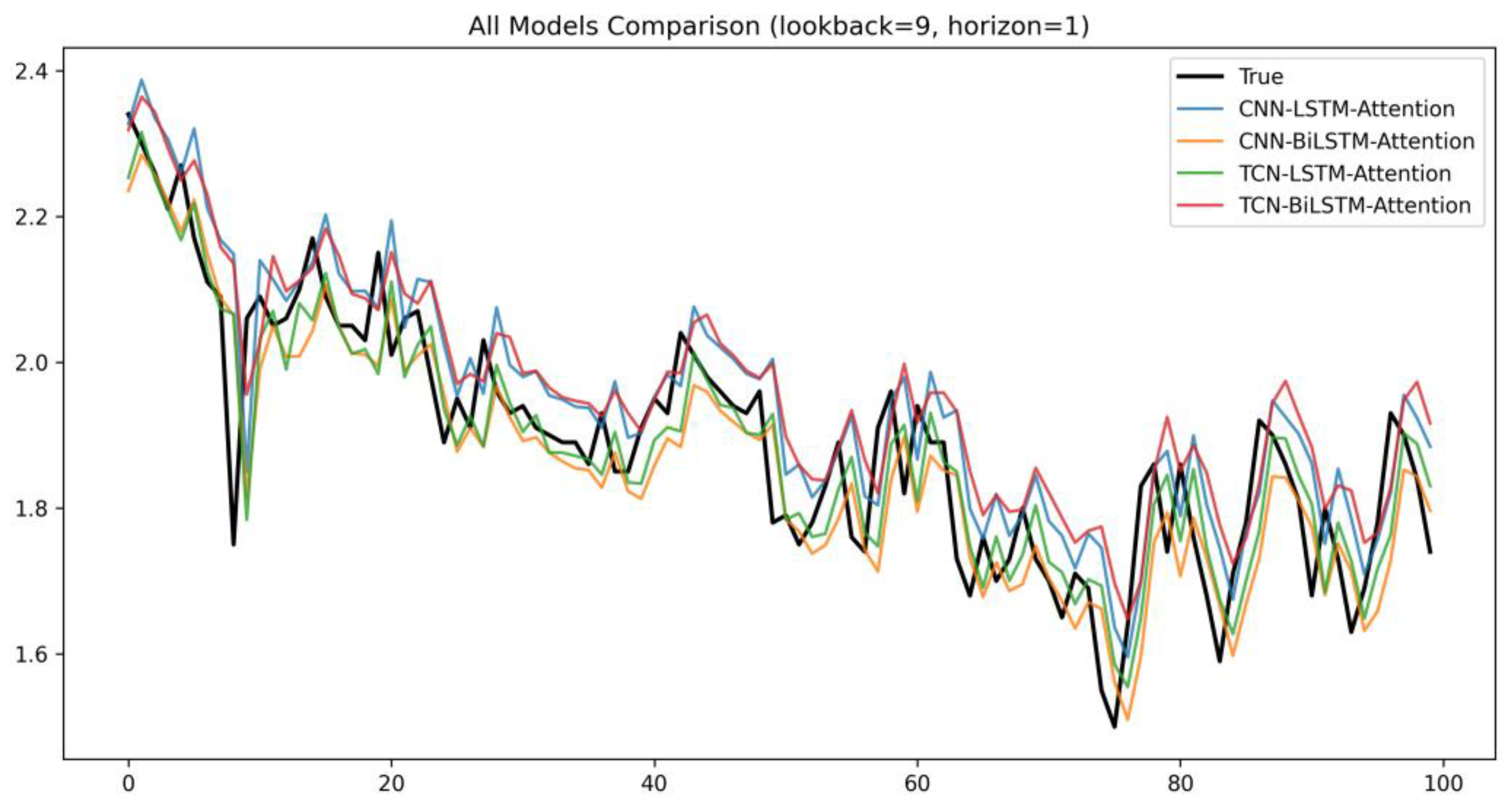 Table 4 presents the forecasting performance of the four hybrid models (CNN–LSTM–Attention, CNN–BiLSTM–Attention, TCN–LSTM–Attention, and TCN–BiLSTM–Attention) on the NYMEX dataset. The training period spans from 3 April 1990, to 23 April 2018, and the testing set covers 24 April 2018, to 17 June 2025. When the lookback window is 9, the results indicate that all models achieve highly accurate short-term forecasts. For one-step-ahead prediction (horizon = 1), the MAE remains low at 0.112–0.116, the RMSE is around 0.176–0.184, the MAPE is close to 3.2%, and the R