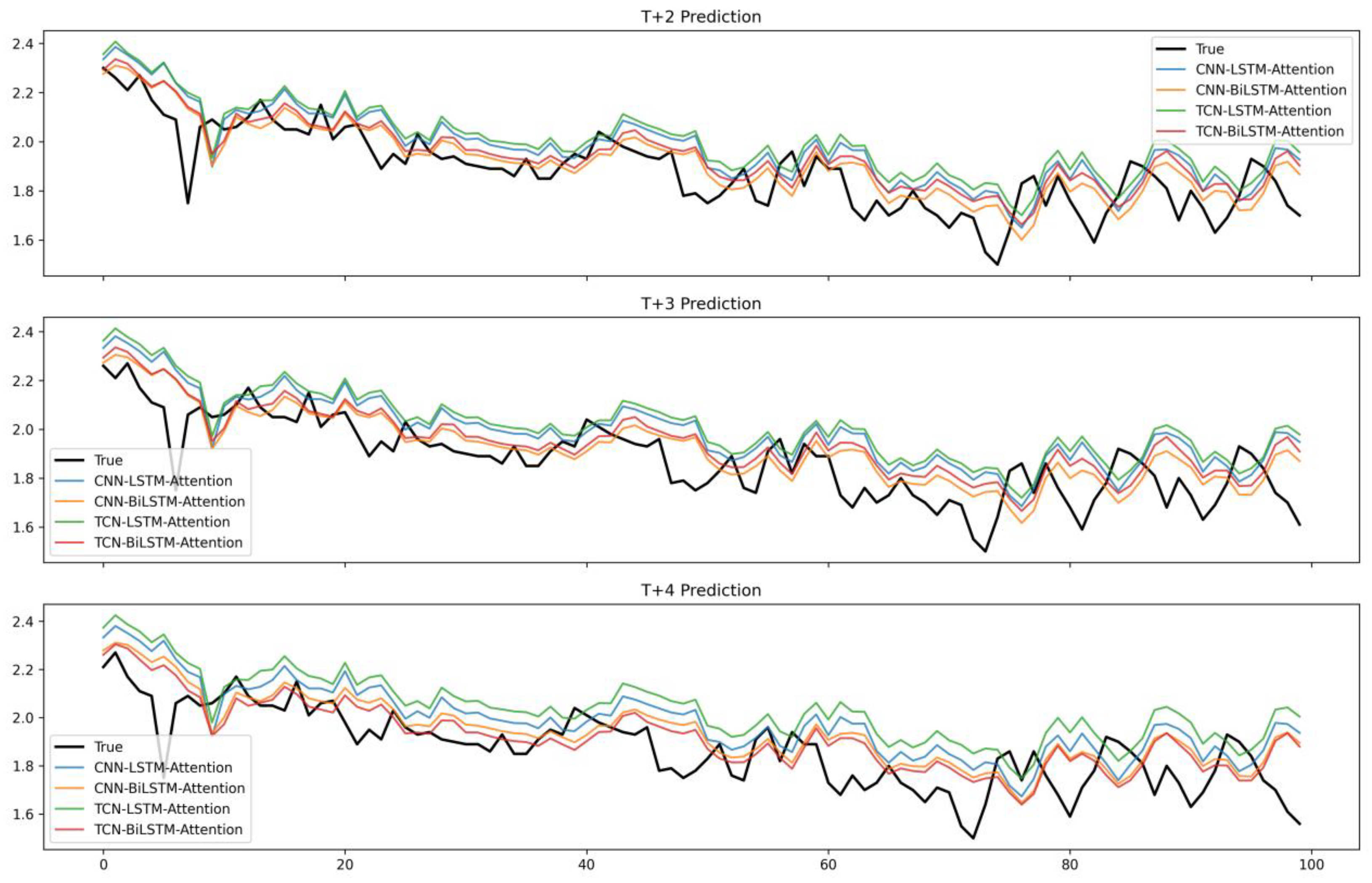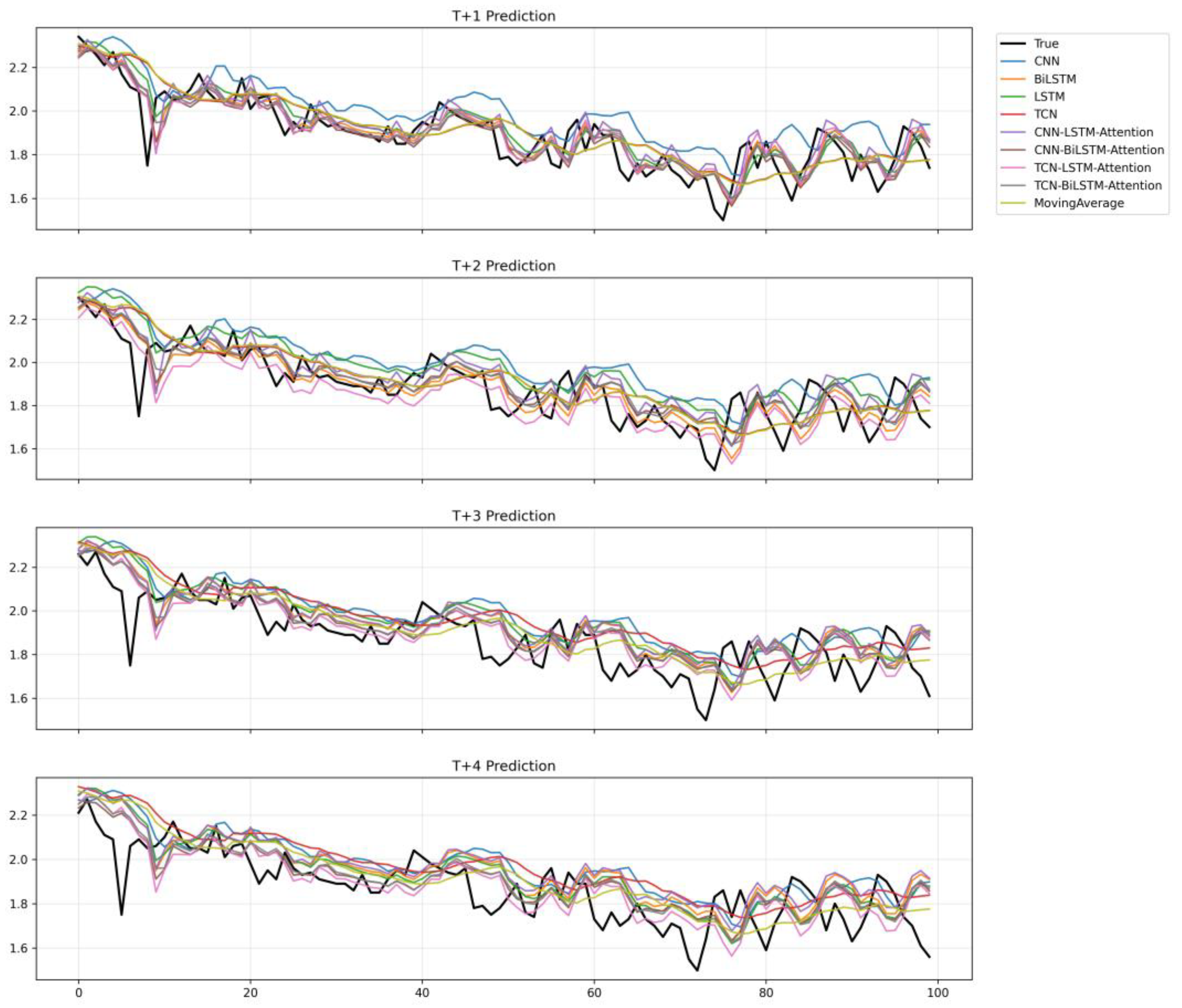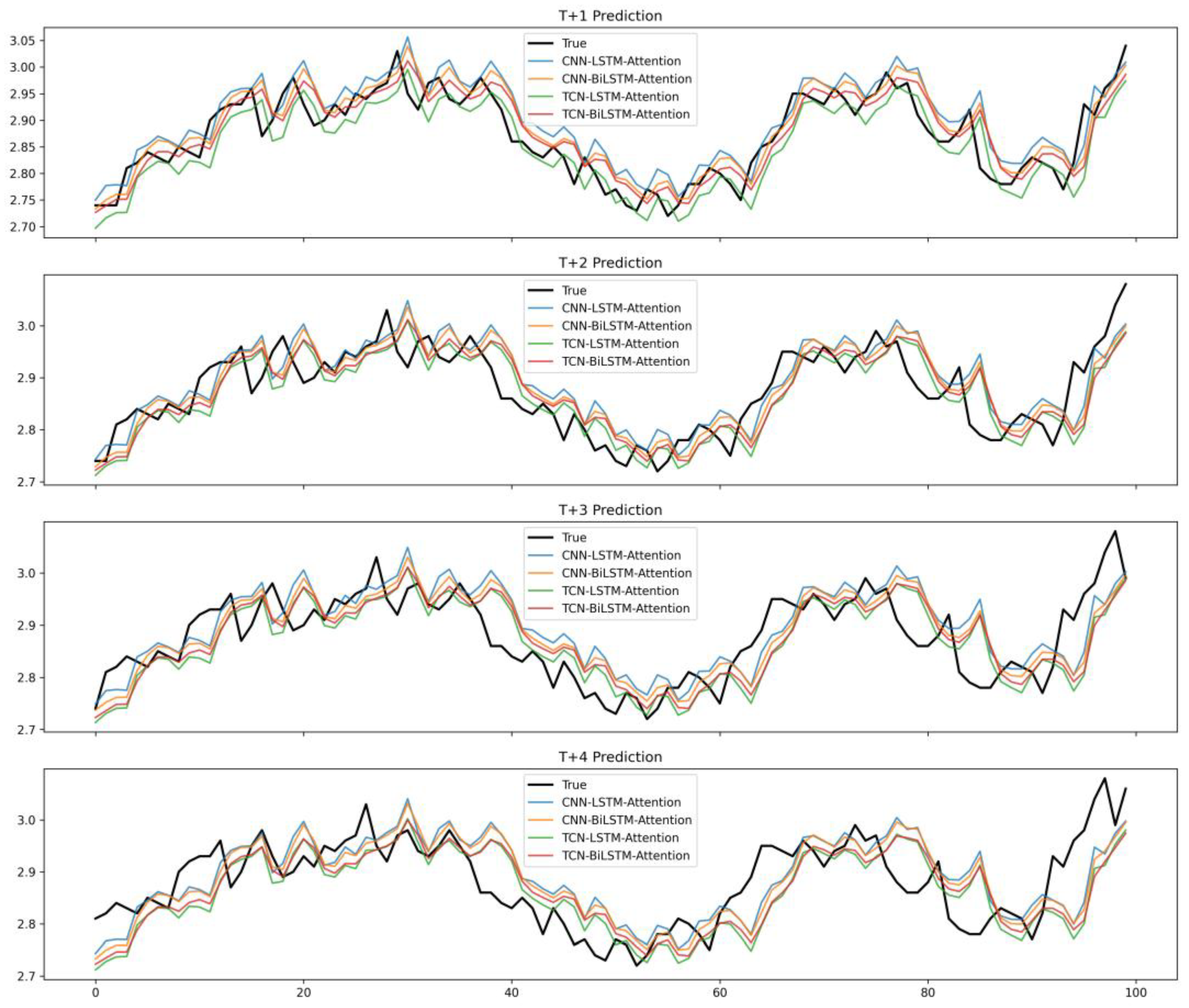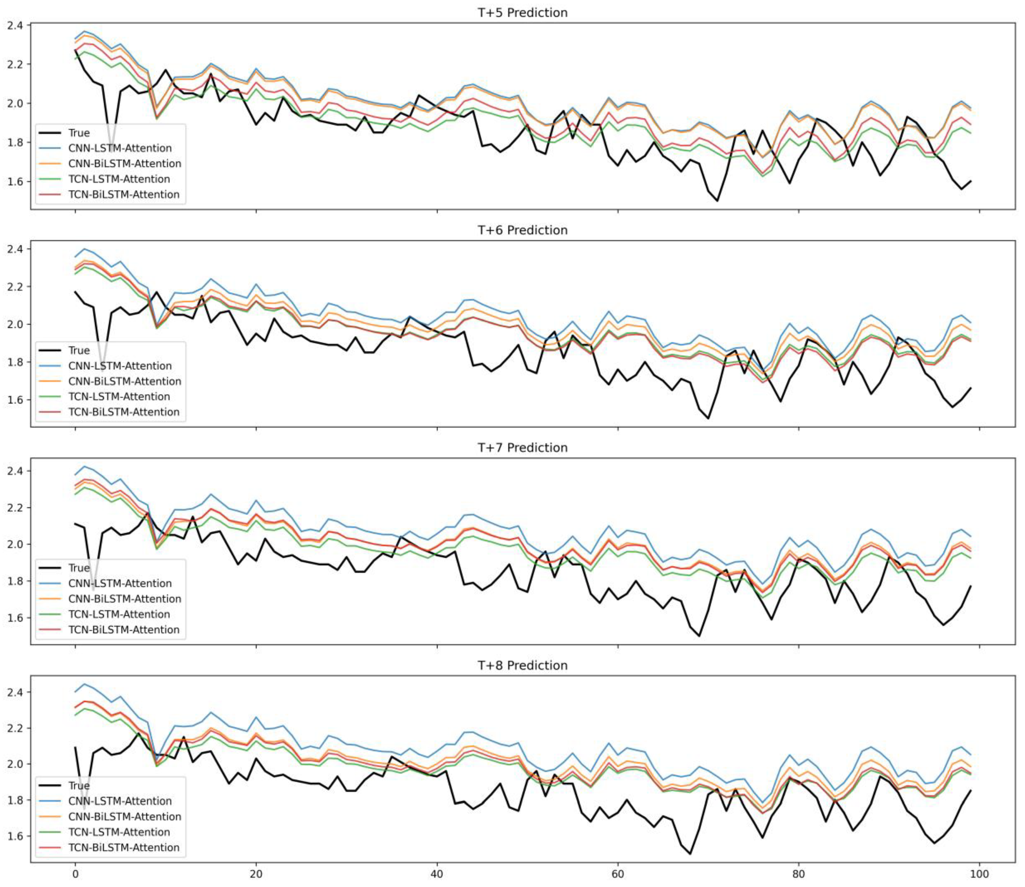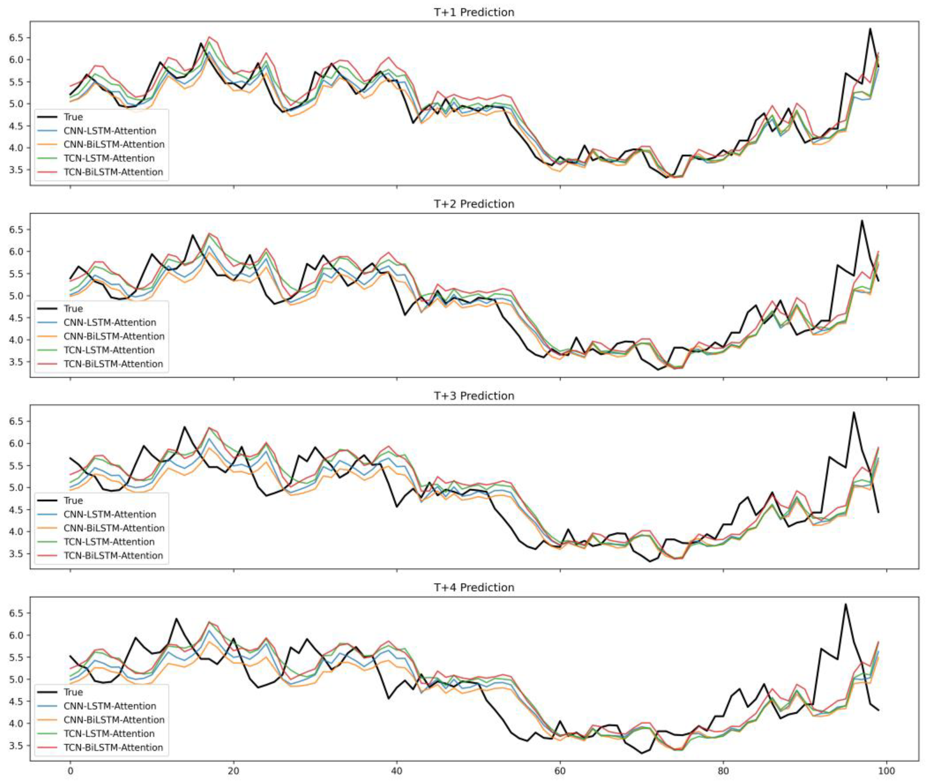 The results reveal that with a forecasting horizon of one step (T + 1), all four models achieve high predictive accuracies, with all R2 values exceeding 95%. CNN-BiLSTM-Attention and TCN-LSTM-Attention exhibit slightly better performance, with MAE values of 0.177 and 0.180, respectively, an MAPE of around 5.0%, and an R2 above 95.8%. As the forecasting horizon increases from 2 to 4 steps, errors gradually increase, and the explanatory power decreases, with R2 declining to around 91%. This confirms the inherent challenge of long-term forecasting. Notably, CNN-BiLSTM-Attention maintains a relatively stable performance, suggesting stronger robustness under extended horizons.