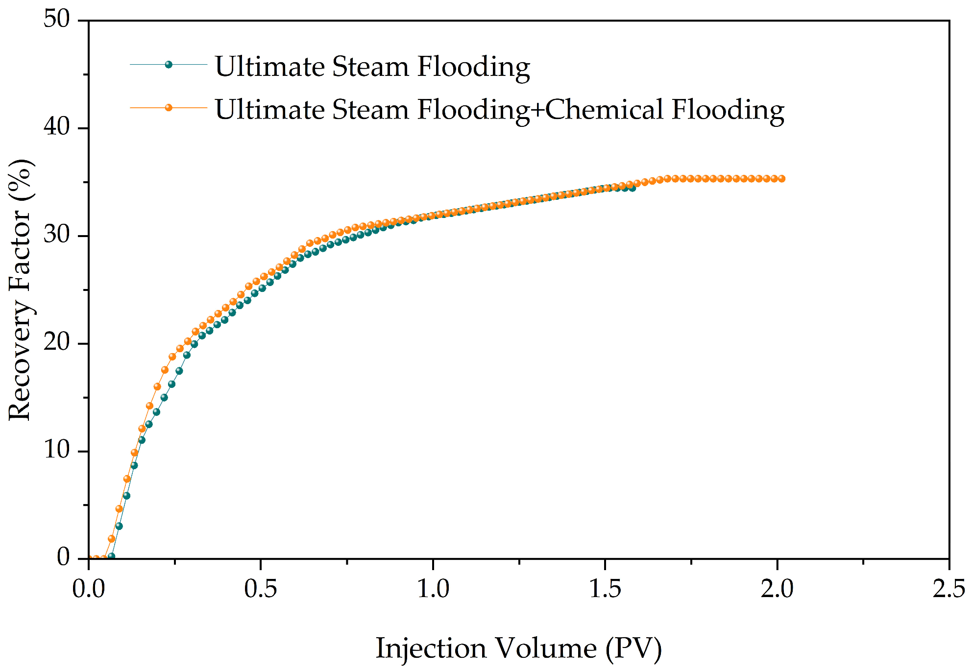 3-1 | After steam flooding to 15% oil recovery factor, switch to 0.8% concentration viscosity reducer flooding until the limit. | 2674.5 ± 20.5 | 41.44 ± 2.04 |