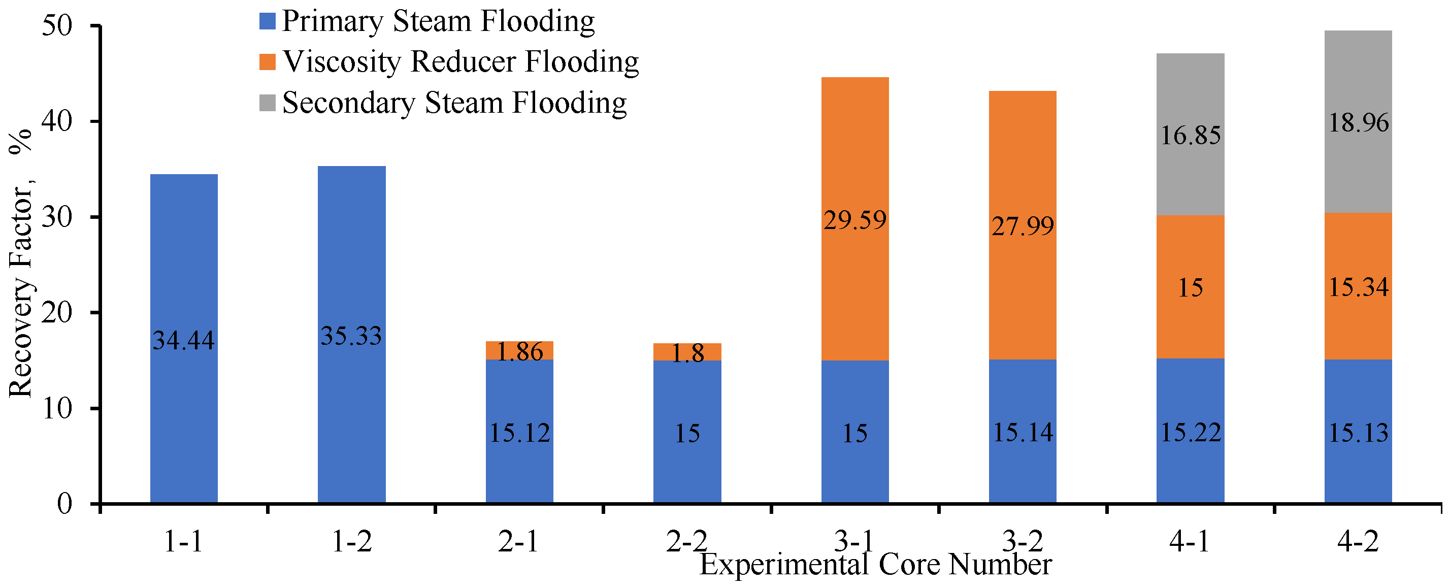 4-1 | After steam flooding to 15% recovery factor, switch to 0.8% concentration viscosity reducer flooding for 3 pore volumes (PV), then switch back to steam flooding to ultimate state. | 2543.5 ± 33.5 | 39.75 ± 0.68 |
