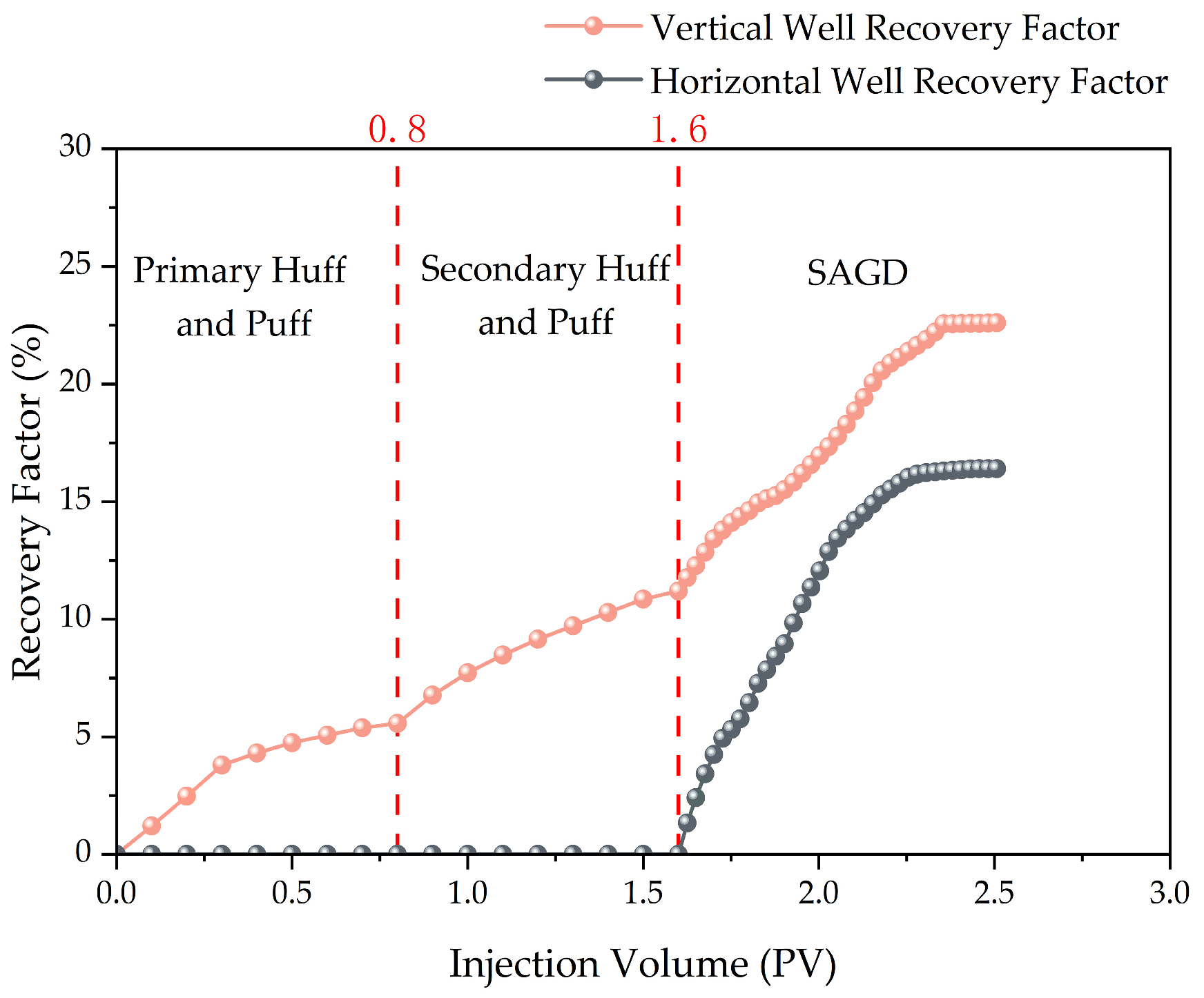 - To further improve the research accuracy, the optimized experimental design adopts actual reservoir cores instead of sand-packed tubes and combines CT scanning technology to real-time monitor the oil saturation distribution during the displacement process. It also explores the “viscosity reducer-SAGD-CO2” ternary composite technology [36,37]: leveraging the synergistic effect of CO2 (with swelling and viscosity reduction properties) and the interfacial activity of viscosity reducers to reduce crude oil viscosity; meanwhile, the low-density characteristic of CO2 alleviates the steam overriding issue and improves the vertical sweep efficiency [38]. Additionally, the evaluation system established in this study demonstrates significant advantages compared with polymer surfactant (PS) [39,40], nanoparticle (NP), and CO2-assisted systems: For PS, its evaluation is isolated and lacks core indicators, whereas this system forms a “parameter-process-field” closed loop based on core indicators [41]; For NP, its evaluation lacks macro-micro correlation, while this system achieves dual-scale synergy between the viscosity reducer’s mechanism of action and steam chamber expansion; For CO2-assisted systems, their evaluation lacks stage-specific decomposition, but this system clarifies the “chemical–thermal” synergistic mechanism and dismantles efficiency-enhancing links through staged residual oil saturation. The “viscosity reducer-SAGD-CO2” ternary composite technology focuses on the steam overriding problem in gravity drainage-assisted steam flooding. It deduces a steam overriding coefficient model based on “pressure gradient–vapor-liquid density difference” and reveals the law that the “lag” of vapor phase migration behind the isobaric surface of the oil–water liquid phase, as well as the improvement effect of well pattern regulation on overriding. However, it fails to incorporate three aspects: the influence of viscosity reducers on steam overriding, the correction effect of CO2 on vapor-liquid density difference and pseudo mobility ratio, and the correlation with quantitative evaluation of residual oil saturation. In the future, based on the above two (the established evaluation system and the ternary composite technology), efforts should be made to address the limitations of the former’s homogeneous experiments and the latter’s overriding theory: deepen the dynamic correction of the overriding coefficient under the “viscosity reducer-CO2-steam” ternary system; improve the “horizontal priority” regulation technology for steam chamber expansion in heterogeneous/middle-deep reservoirs; establish a full-scale evaluation system covering microscale interfacial interactions (molecular adsorption among viscosity reducer, CO2, and crude oil), mesoscale pore flow (CT-monitored fluid distribution), and macroscale reservoir development (dual indicators of residual oil saturation and overriding degree); break through the limitations of the former’s single switchover timing of flooding and the latter’s non-intelligent well pattern regulation, and realize dynamic optimization of injection-production parameters through real-time monitoring and intelligent algorithms. Ultimately, these efforts will promote the field application of thermal-chemical-CO2 synergistic development for extra-heavy oil [42], while simultaneously optimizing the matching scheme of well type combination and development method for maximizing recovery efficiency.