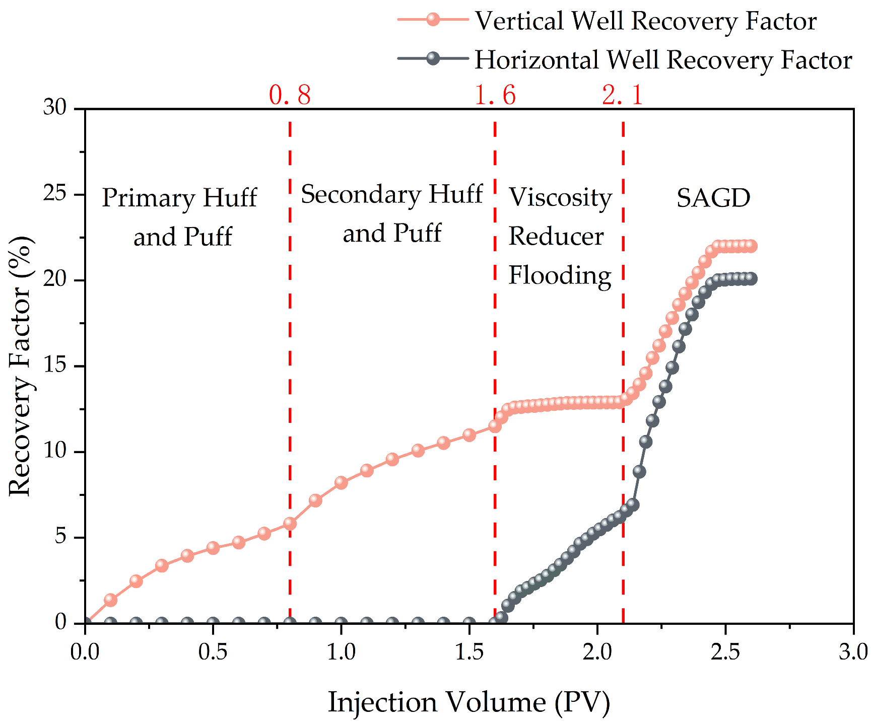 2-1 | After steam flooding to 15% oil recovery factor, switch to 0.2% concentration viscosity reducer flooding until the limit. | 2604.0 ± 8.5 | 38.75 ± 0.72 |