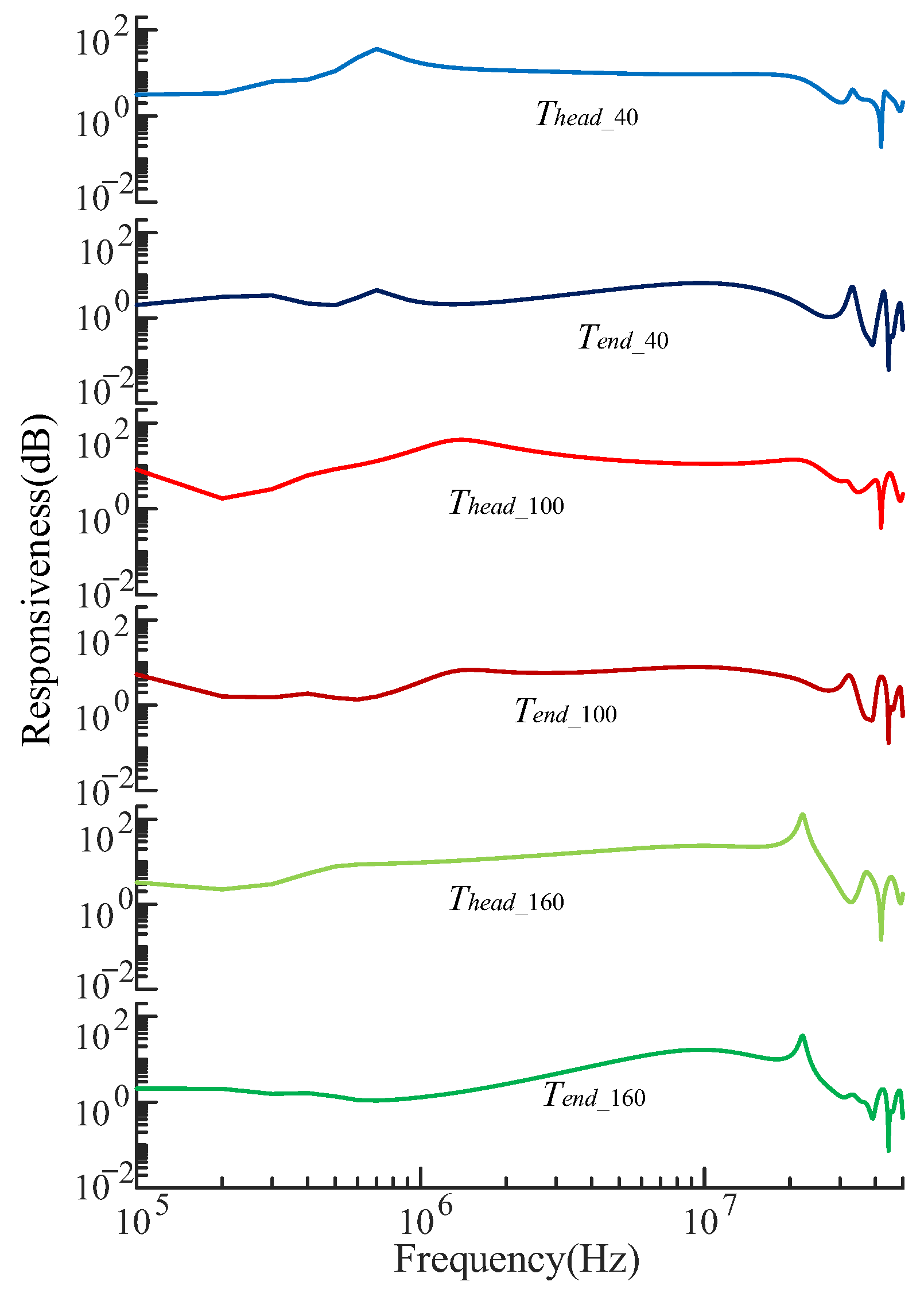 Figure 5 shows, the transformer winding has different amplification/decreasing effects on signals of different frequency components. At certain resonant frequencies, the transformer winding may greatly increase the signal at this frequency. In terms of the transfer function curves, taking the curve starting from the 40th turn as an example, the peaks and troughs of the transfer function from the 40th turn to the winding head exhibit a similar pattern to those from the 40th turn to the winding end. The magnitudes of the peaks and troughs in the transfer function to the winding head are higher than those to the winding end. Furthermore, the transfer function to the winding end displays a distinct peak around 10 MHz and a trough around 1 MHz, while no such peak is observed in the transfer function to the winding head. The same characteristics were observed for the 100-turn and 160-turn cases.