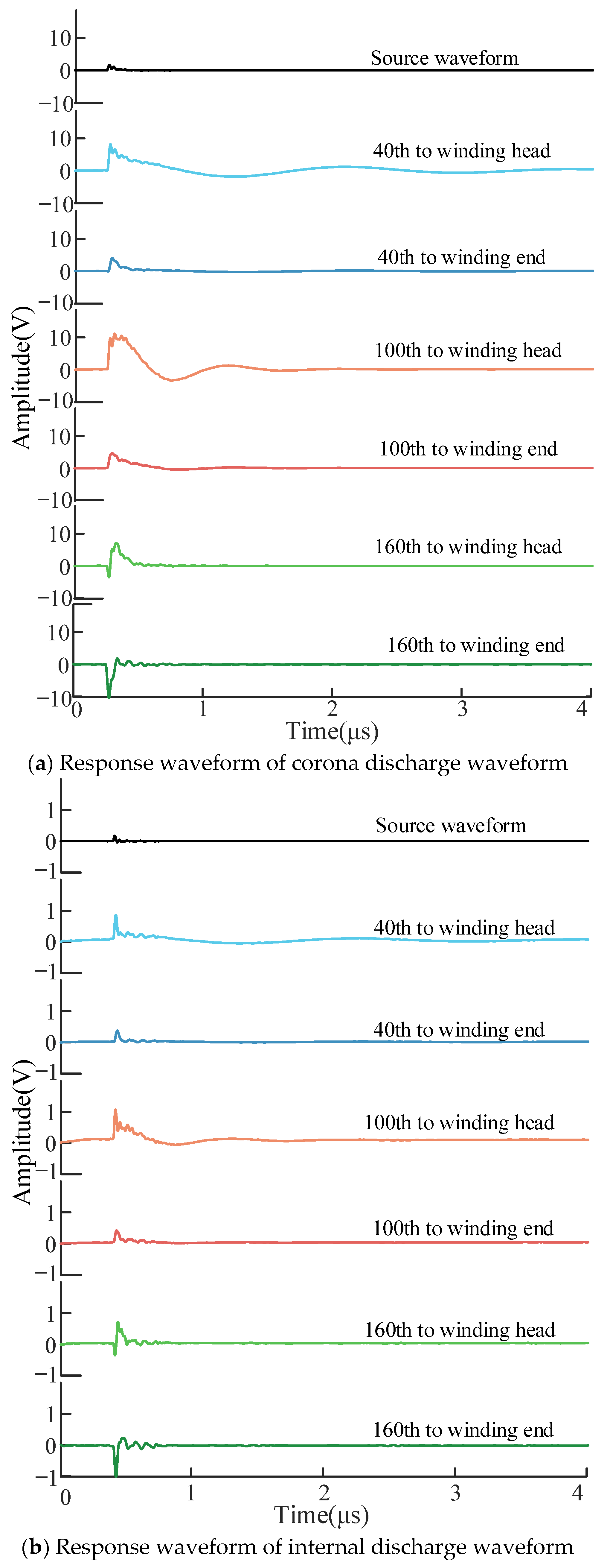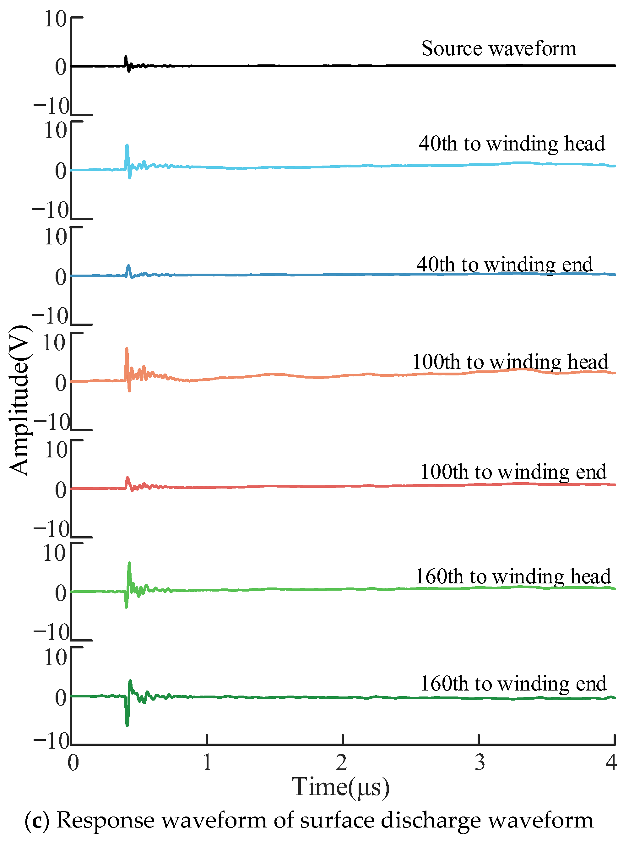 In terms of different types of PD waveforms: Since most frequency components of corona discharge and part of the internal discharge fall below 10 MHz, these two types of discharges produce response waveforms with large oscillation amplitudes when originating from the 40th or 100th turns and propagating to the winding head. On the other hand, since certain frequency components of both internal discharge and surface discharge are concentrated around 20 MHz, these waveforms result in response waveforms with larger negative-polarity peaks when propagating from the 160th turn to either the head or the end of the winding.