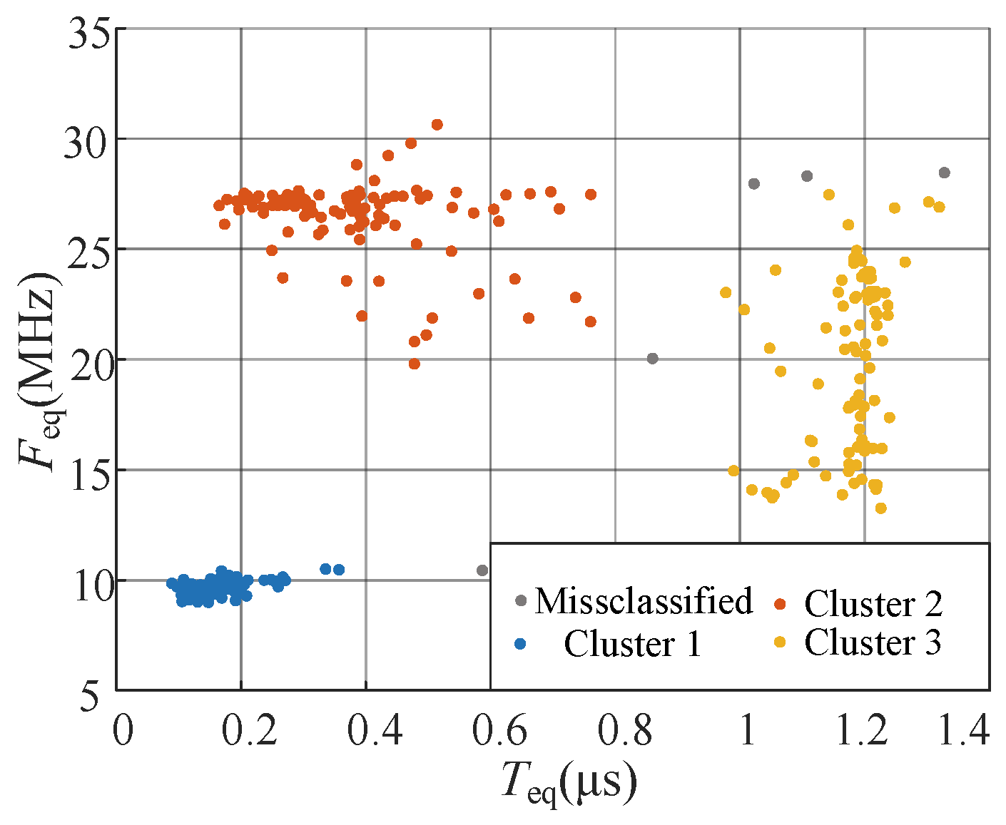 Figure 9, the two-dimensional equivalent time–frequency plane projections of the PD response waveform set exhibit considerable alterations compared to those of the source discharge waveforms. Both the intra-cluster distances within the same type of discharge waveform sets and the inter-cluster distances between different types are noticeably reduced. Particularly, the equivalent frequencies of the response waveforms become lower and more concentrated than those of the source discharge waveform sets. This can be attributed to the fact that the path from the discharge source to either the head or the end of the winding functions as a two-port network, imparting a frequency-selective filtering effect on the waveforms.