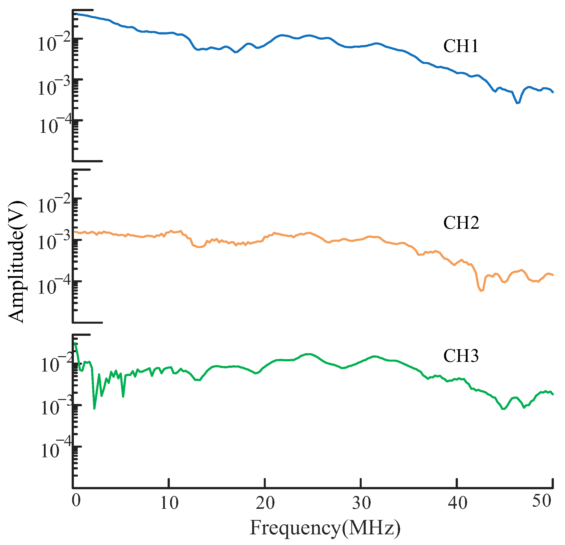 Figure 10, the frequency-domain distributions of three typical partial discharge waveforms are illustrated. The frequency components of the corona discharge waveform are concentrated below 10 MHz; those of the internal discharge waveform are mainly distributed below 10 MHz and within 20–30 MHz, while the surface discharge waveform exhibits frequency components concentrated primarily in the 20–40 MHz range.