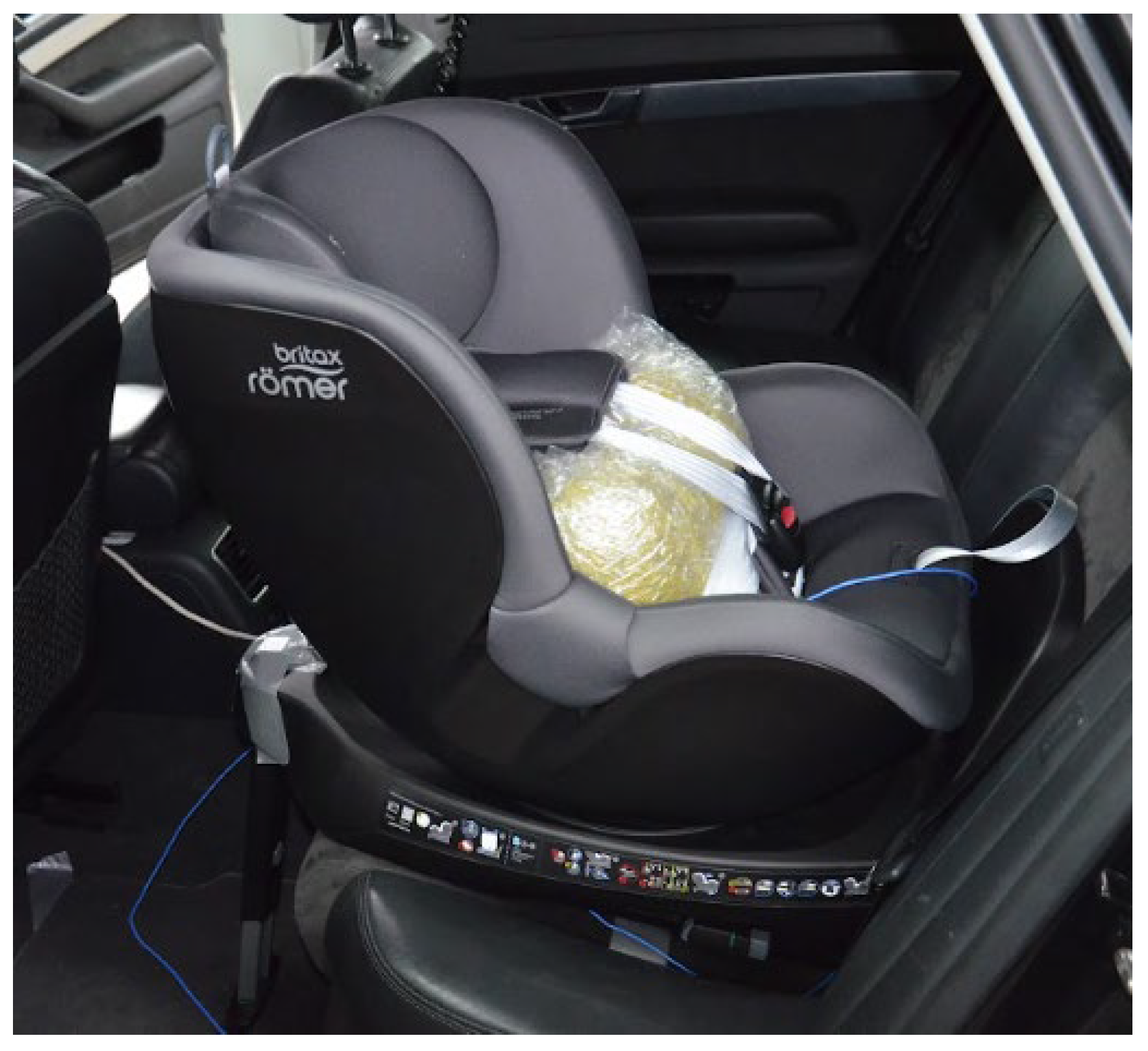 For measurements on the ISOFIX base under the seat at 20 km/h in the Audi A6, the minimum VDV was 1.5045 m/s1.75 (PZL-40, 9.5 kg, fourth seat), while the maximum was 4.8996 m/s1.75 (PP-30, 14.5 kg, fourth seat), about 3.26 times greater. The RMQ values in the Audi A6 increased from 0.9379 m/s2 (PZL-40, 9.5 kg, fourth seat) to 2.7365 m/s2 (PP-30, 14.5 kg, fourth seat), about 2.92 times higher. In the Citroën C5, the lowest VDV under the seat was 2.2811 m/s1.75 (PZL-40, 9.5 kg, first seat), and the highest 5.2551 m/s1.75 (PP-30, 14.5 kg, fourth seat), about 2.30 times greater. The RMQ values in the Citroën C5 increased from 1.3357 m/s2 (PZL-40, 14.5 kg, first seat) to 2.9799 m/s2 (PP-30, 14.5 kg, fourth seat), about 2.23 times. This sensor location showed the lowest absolute RMQ minima in the dataset, consistent with the fact that the base under the seat receives vibrations already partially attenuated by the seat foam and child seat structure.