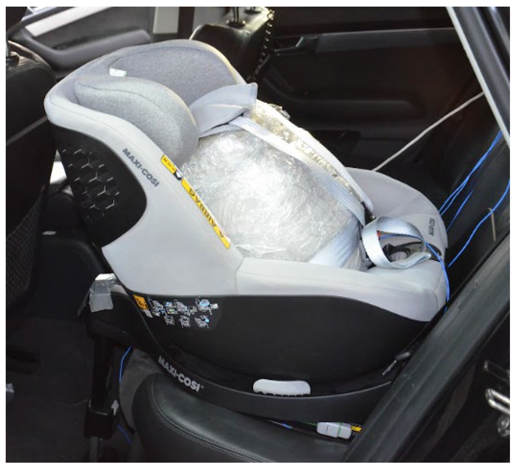 In the fifth child seat, the minimum RMS value was 1.4281 m/s2 (Citroën C5, PZL-40, 3.5 kg), and the maximum 2.548 m/s2 (Citroën C5, PP-30, 3.5 kg), an increase of about 78%. The minimum configuration was classified as “discomfort,” while the maximum exceeded 2 m/s2 and fell into the “extreme discomfort” category. The sensitivity to mass varied: in the Citroën C5 on the PZL-40 bump, values increased with load, whereas on the PP-30 bump higher values were observed already at 3.5 kg compared to 9.5 kg. In the Audi A6 on the PP-30 bump a moderate increase occurred between 3.5 and 9.5 kg, but the lack of measurement at 14.5 kg prevented full trend evaluation.