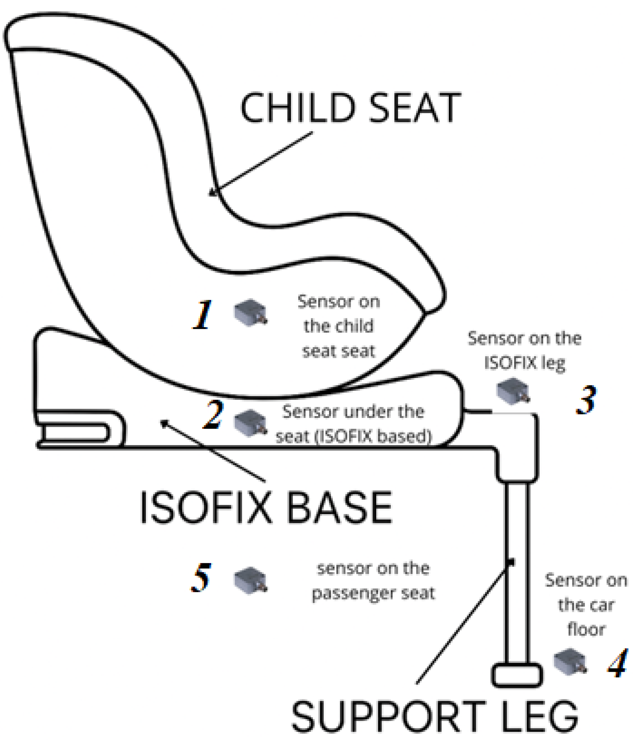 19], i.e., determining the velocity based on the recorded acceleration waveform, calculating the average kinetic power for the effective leg mass of the ISOFIX base and converting it into power and electricity taking into account the total efficiency of the acquisition and conversion path (η ≈ 0.144), it was estimated that it is possible to obtain an average of about Pel ≈ 8.6 mW. This corresponds to the energy accumulated in one hour of driving equal to Eel ≈ 30.8 J (≈8.56 mWh) at vibration amplitudes corresponding to passing through a speed bump. The study analyzed two types of release thresholds. In the case of “throwing” thresholds, generating higher vibration amplitudes, the electricity obtained will be correspondingly higher compared to thresholds with a milder profile. The stored energy can power simple low-power sensors, e.g., to assess the level of discomfort. For a sensor with an average consumption of Psens = 10 μW, the available energy would allow it to operate continuously for about t ≈ 856 h, which corresponds to approx. 35.6 days. For sensors with higher power consumption, the operating time is proportionally reduced, for example, for Psens = 50 μW it is about 171 h (7.1 days), and for Psens = 100 μW about 85.6 h (3.6 days). The adopted measurement methodology and system layout were presented in detail in [
