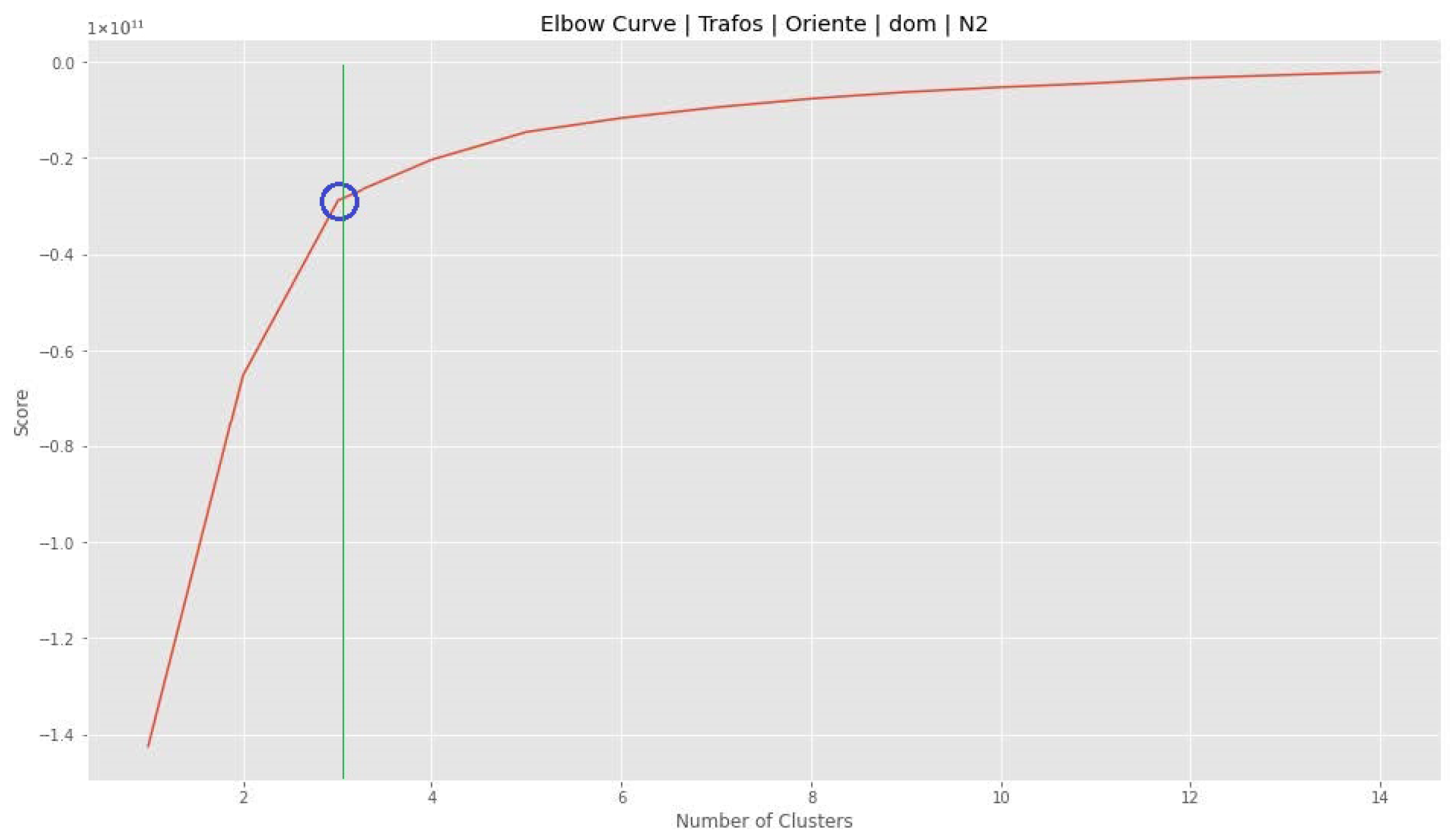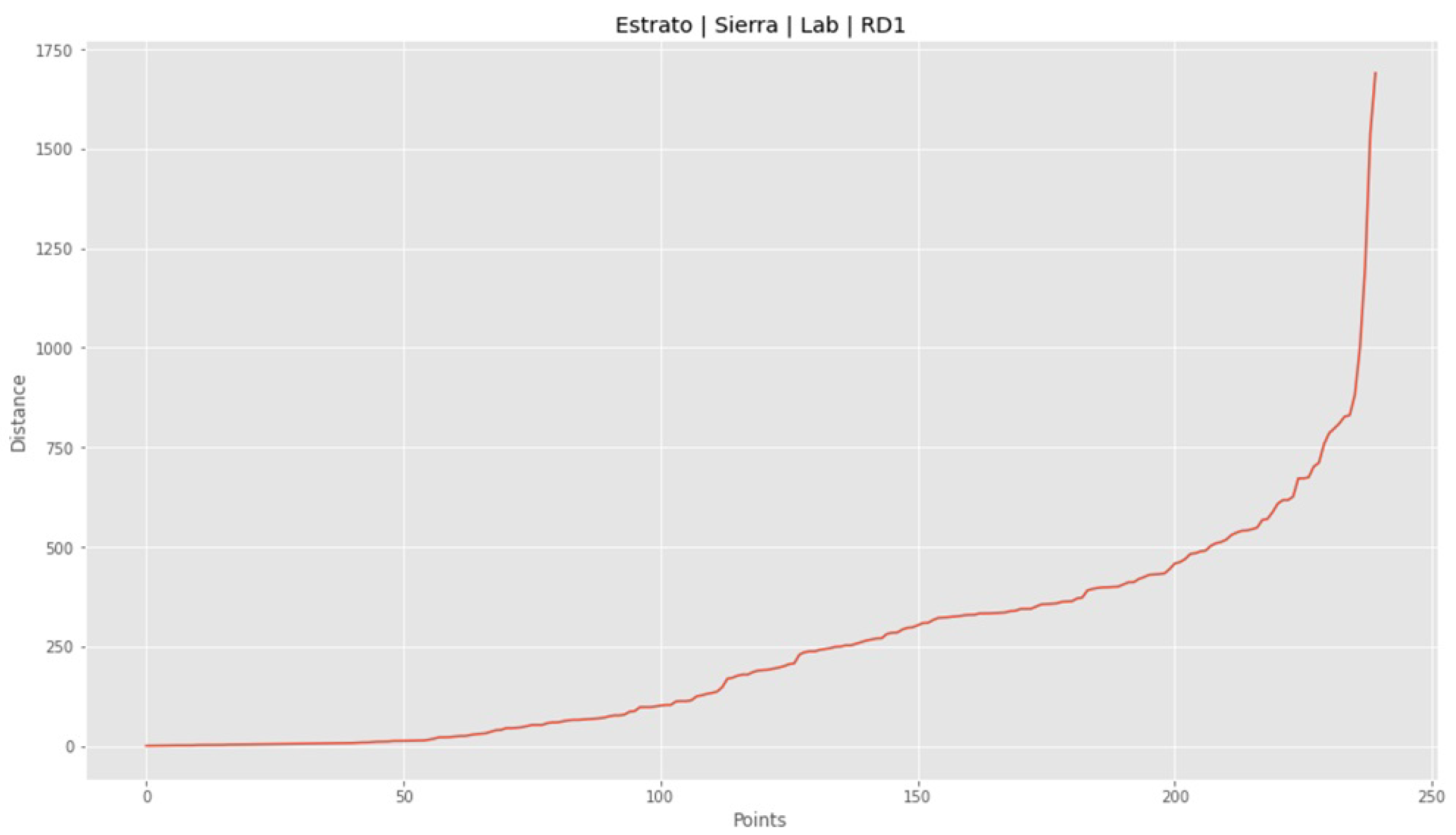 - DBSCAN: To determine this value, the elbow method was used, based on the relationship between the distance among observations and the number of clusters, as illustrated in Figure 3. The optimal number of clusters was established at “5”, as no significant improvement was observed when testing different values around this point.