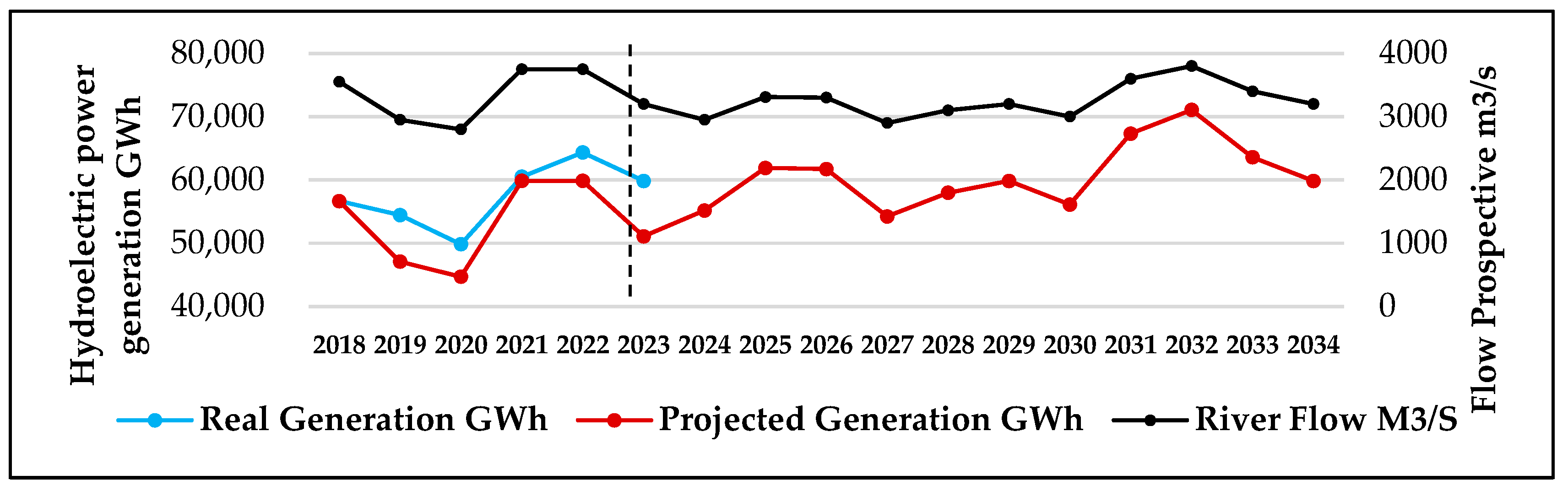 13]. Historical data analysis revealed that river flow behaviour closely resembles that of hydroelectric power generation. Therefore, hydroelectric generation from 2023 onward (marked by a dotted line) was projected based on flow variations, as shown in