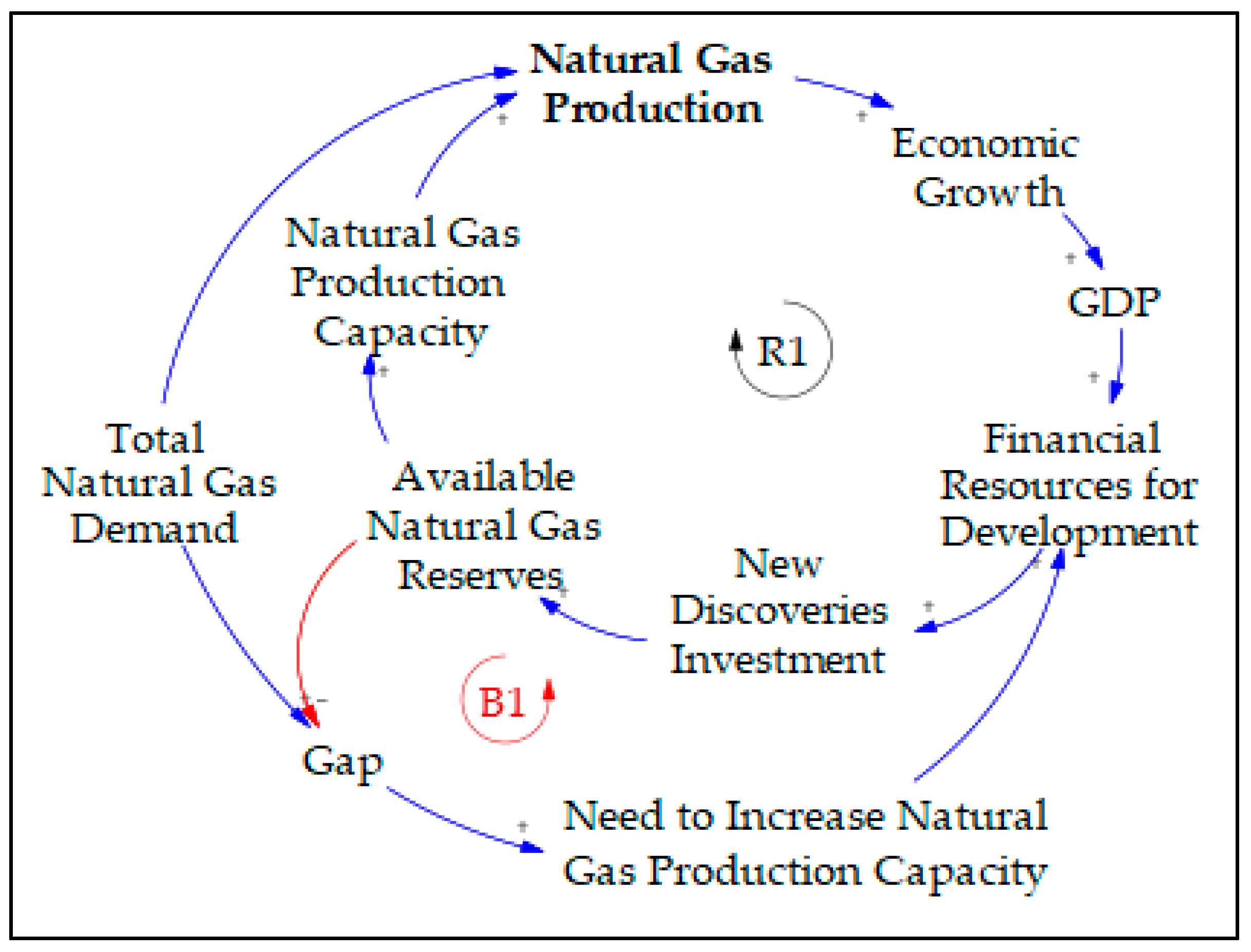 Reinforcing Loop—Natural Gas Production (R1): An increase in Natural Gas Demand requires higher production, which leads to greater economic growth and a larger contribution to GDP. With a higher GDP, more financial resources become available for investment in new discoveries and production expansion. This results in greater Available Gas Reserves. As reserves grow, so does the need to expand production capacity, leading to higher levels of natural gas output.