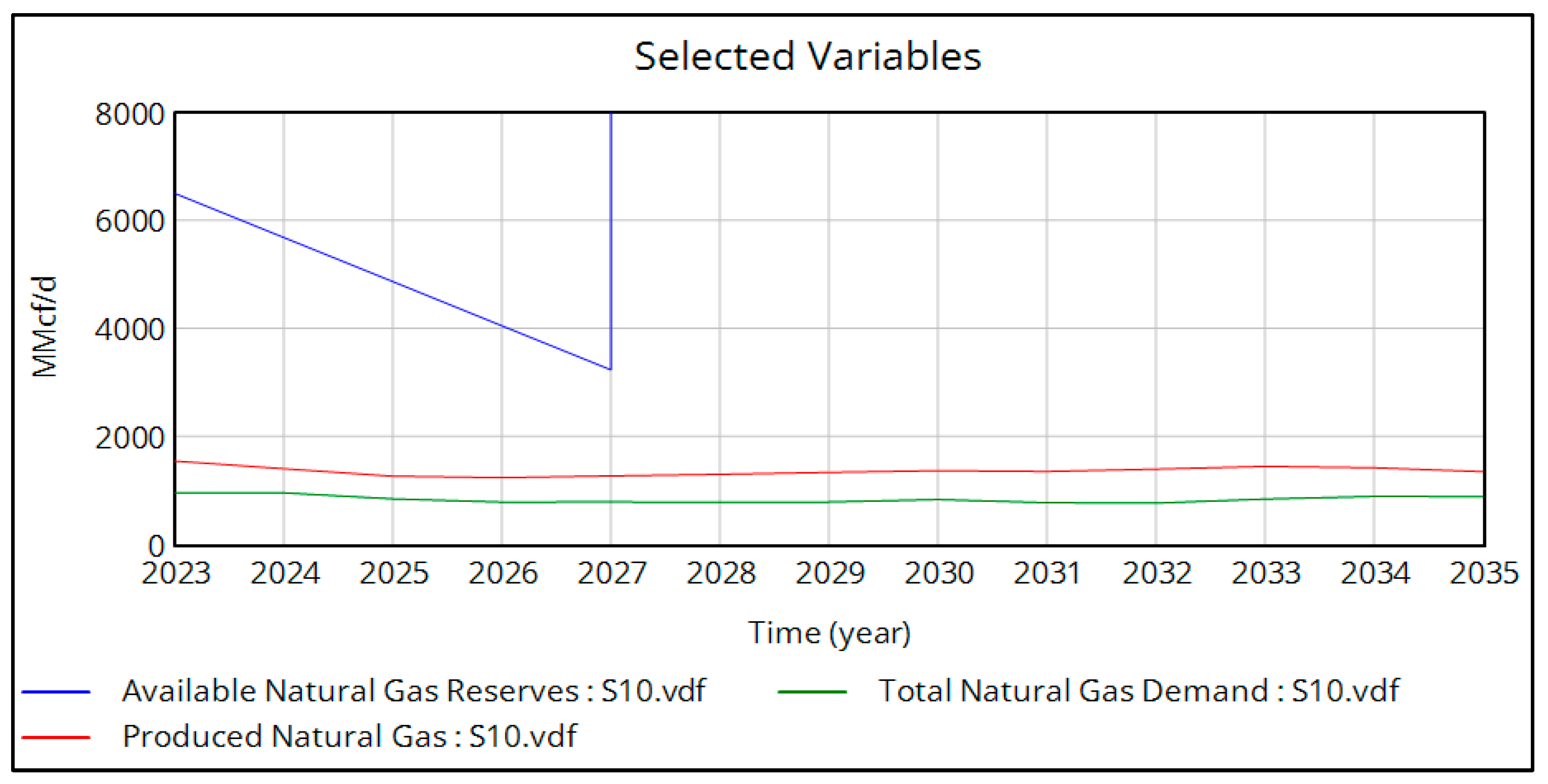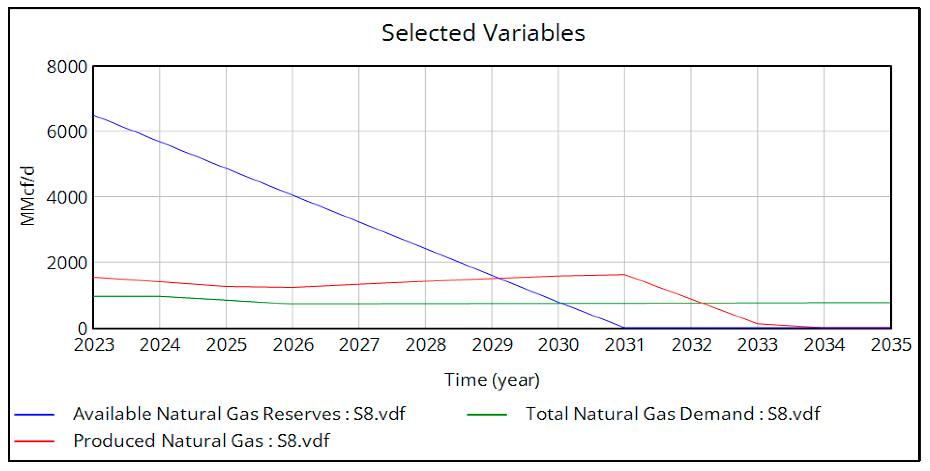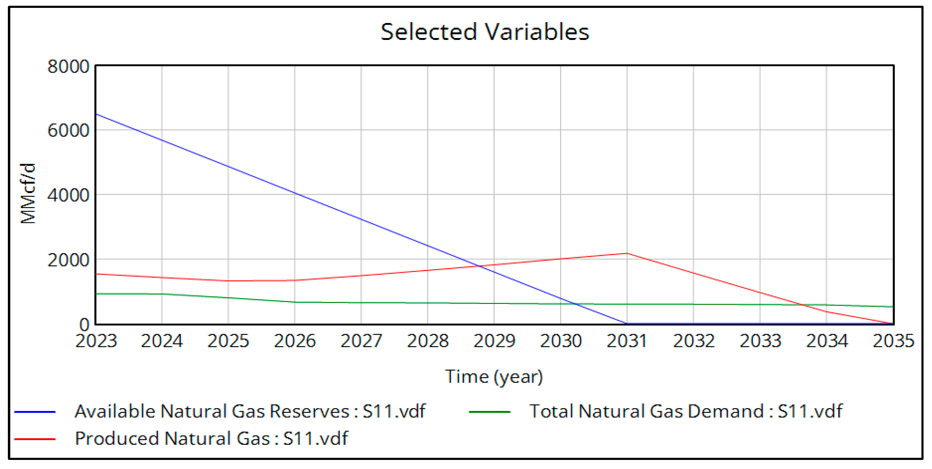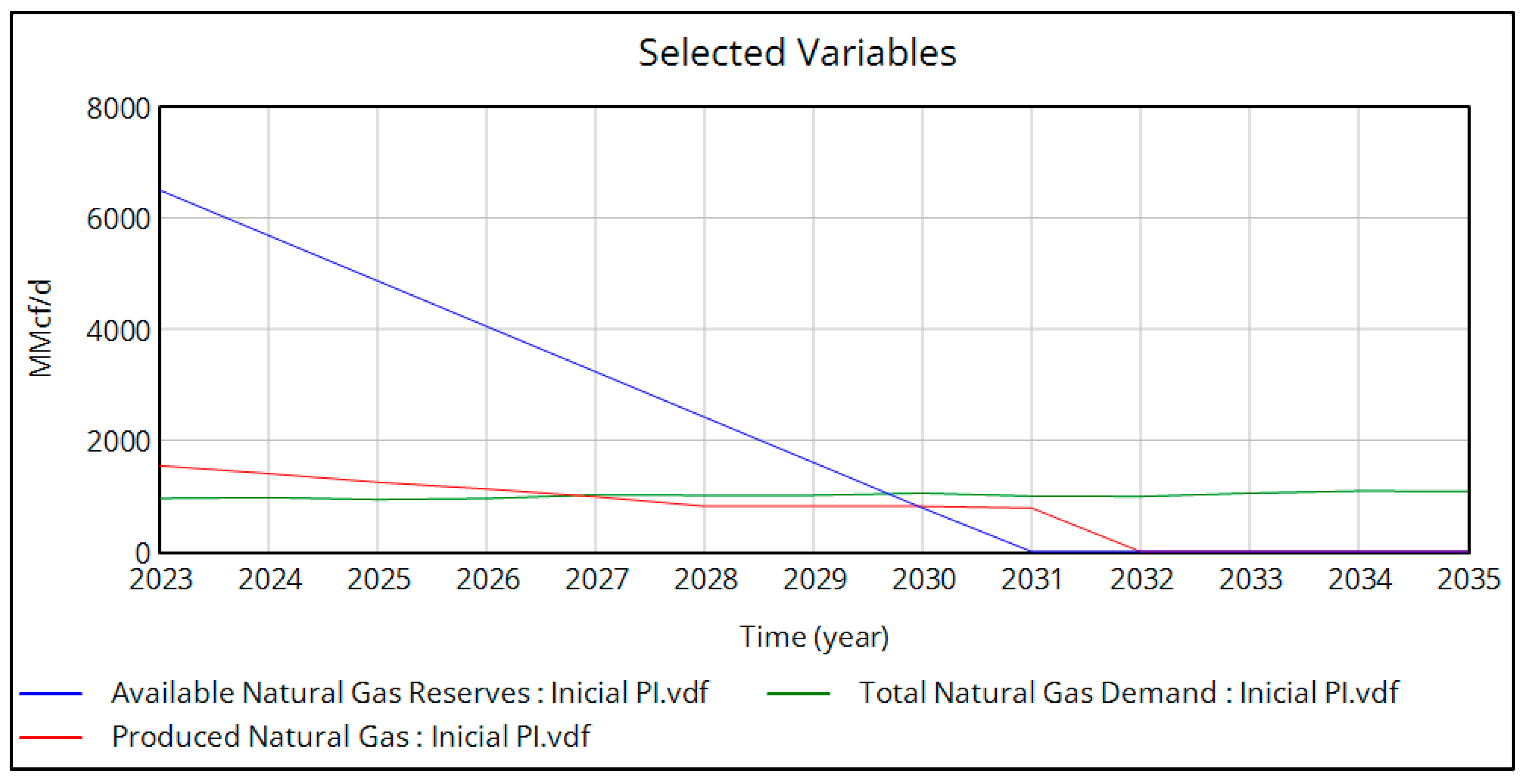 Figure 10, during the second half of 2026, the Natural Gas Produced (red line) intersects with the Total Natural Gas Demand (green line), indicating that, up to that point, the extracted gas meets the projected consumption. From that year onward, a deficit appears as demand surpasses available gas, suggesting the need for new strategies to meet future demand. By the second half of 2030, the Available Natural Gas Reserves (blue line) reach zero, meaning domestic gas resources would be completely depleted by that year. The Natural Gas Produced (red line) falls to zero by the second half of 2031, meaning that despite the depletion of reserves in 2030, existing inventories allow part of the demand to be covered until 2031. In conclusion, from 2027 onward, alternative measures such as imports must be considered to meet the projected demand.