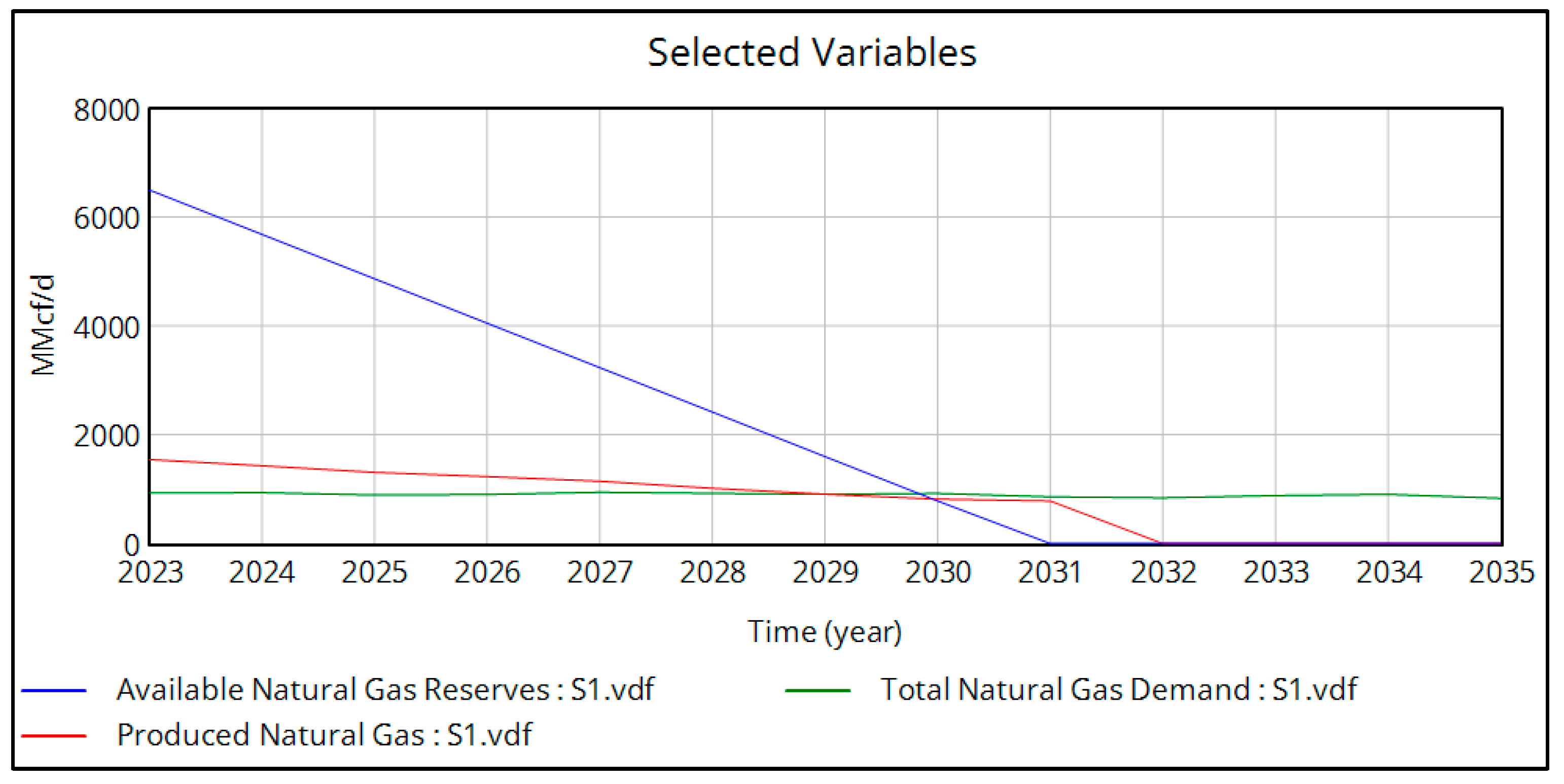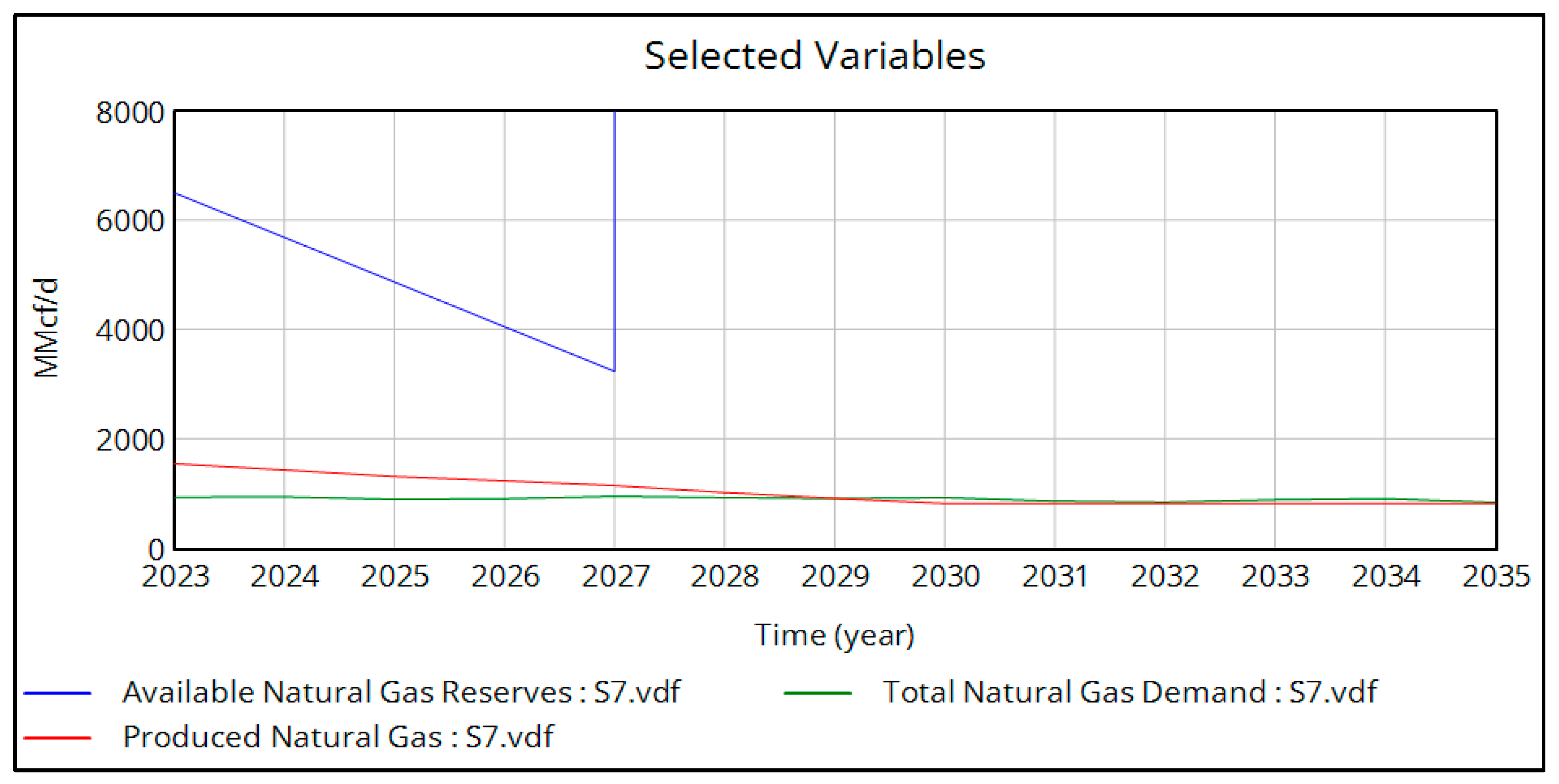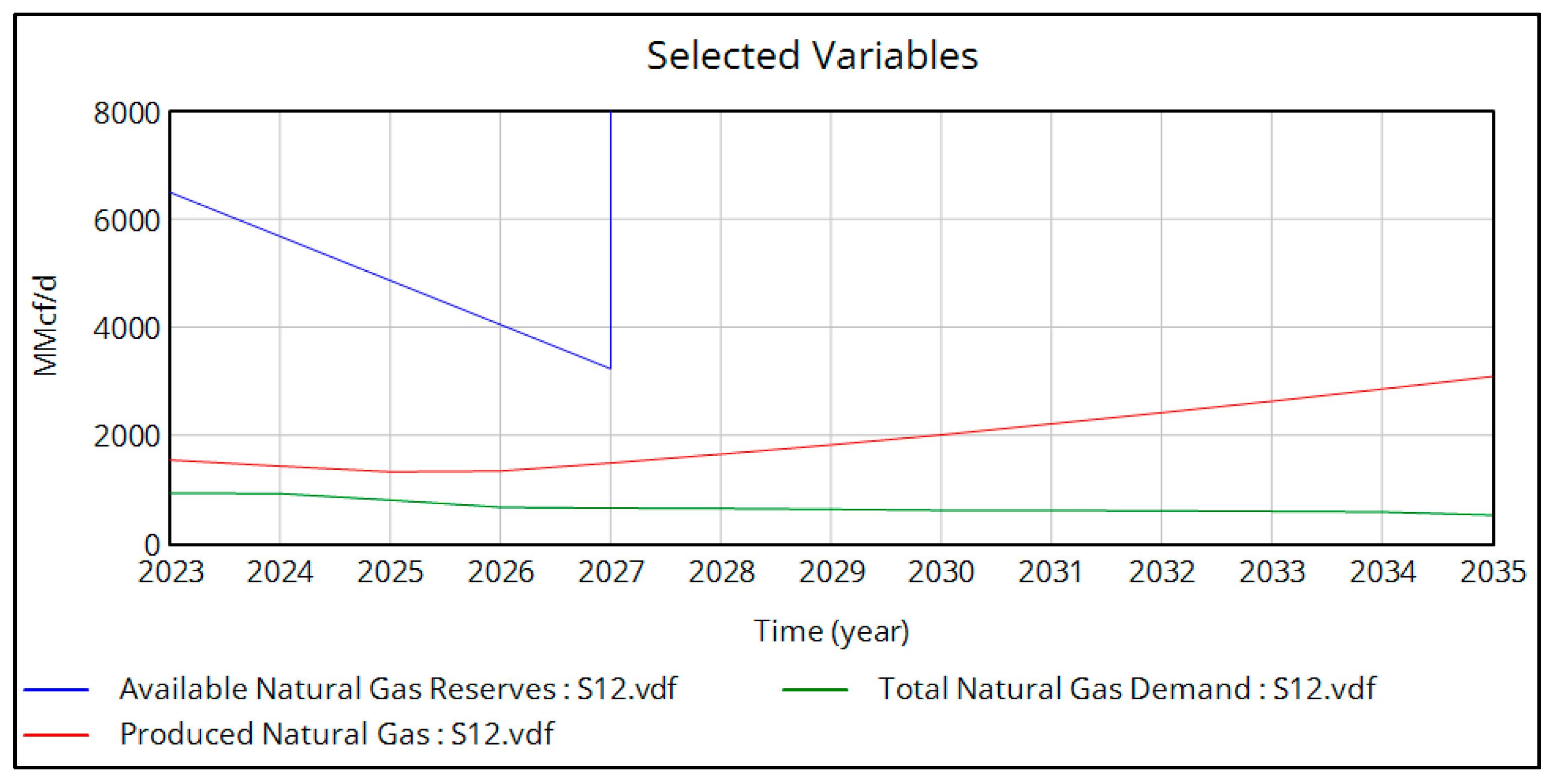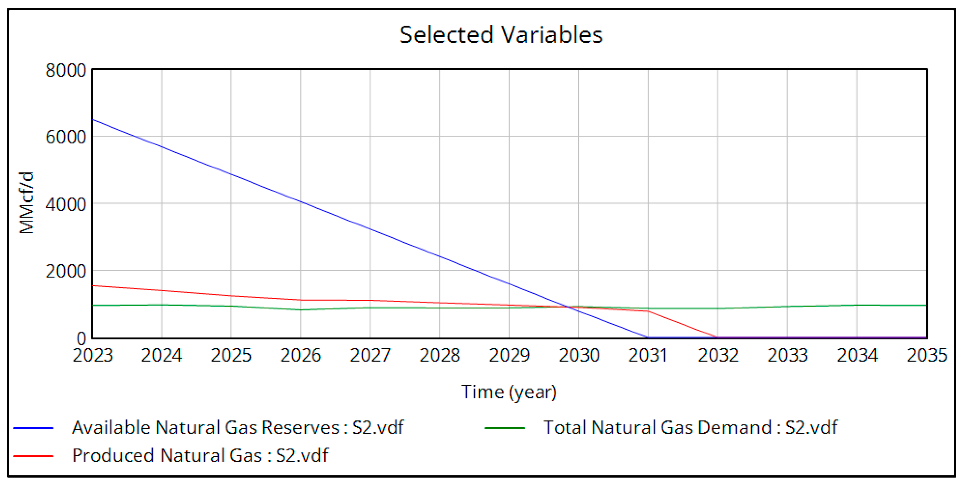 Figure 10, during the second half of 2026, the Natural Gas Produced (red line) intersects with the Total Natural Gas Demand (green line), indicating that, up to that point, the extracted gas meets the projected consumption. From that year onward, a deficit appears as demand surpasses available gas, suggesting the need for new strategies to meet future demand. By the second half of 2030, the Available Natural Gas Reserves (blue line) reach zero, meaning domestic gas resources would be completely depleted by that year. The Natural Gas Produced (red line) falls to zero by the second half of 2031, meaning that despite the depletion of reserves in 2030, existing inventories allow part of the demand to be covered until 2031. In conclusion, from 2027 onward, alternative measures such as imports must be considered to meet the projected demand.