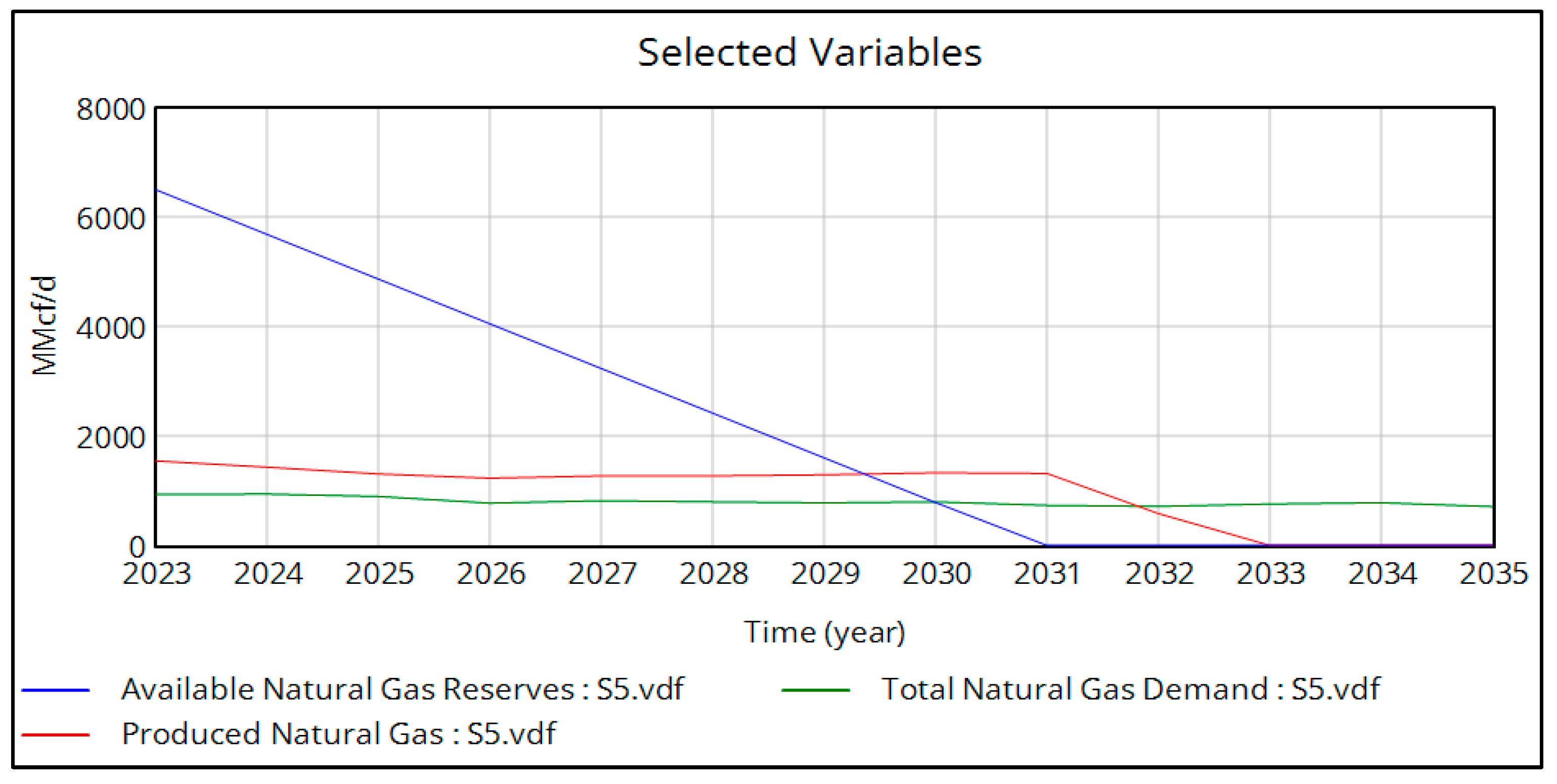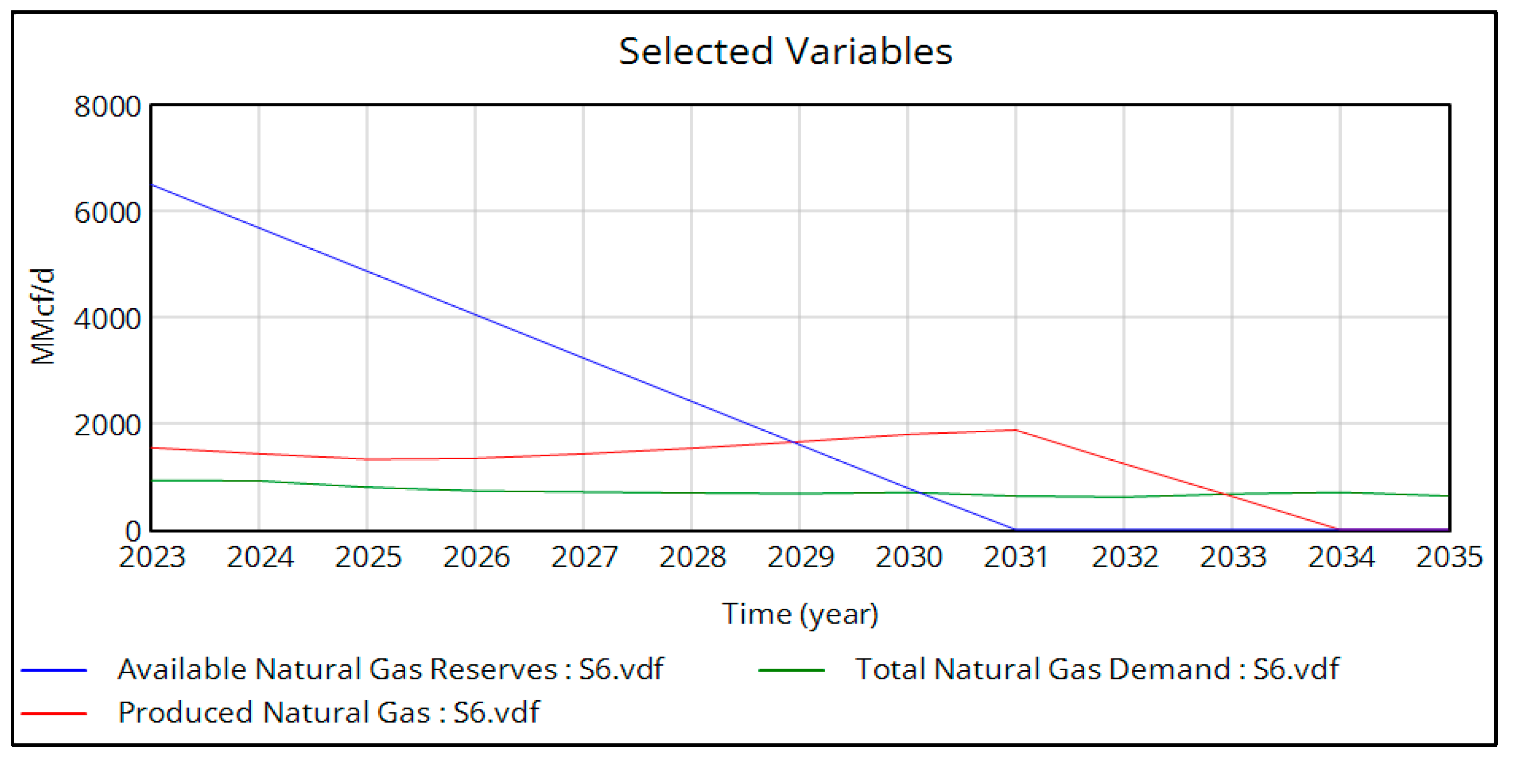 Table 6, under current conditions in the integrated demand and supply model, Natural Gas Production meets 100% of projected demand until the second half of 2026 and is depleted by the second half of 2030.