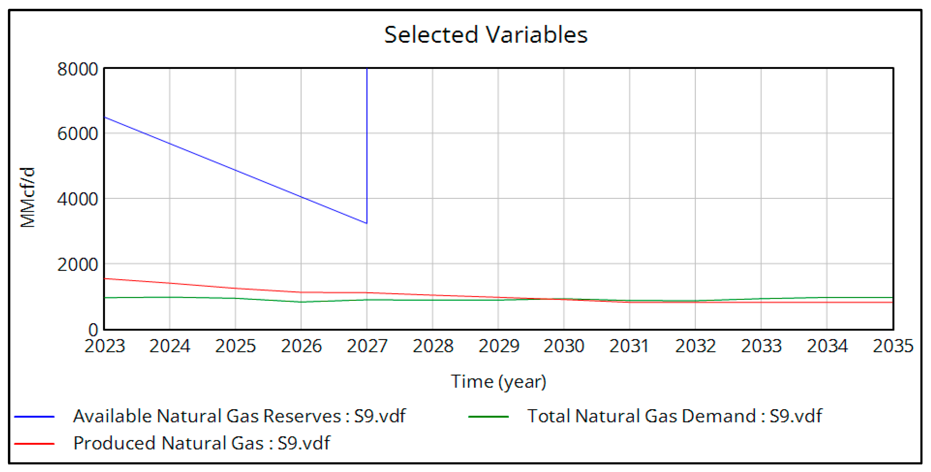 It is important to note that, in Scenarios 4, 7, and 9, where the new well is included, there is still unmet demand—not due to a lack of gas, but because the extraction rate remains constant. This suggests that increasing the extraction rate would be necessary to meet projected consumption.