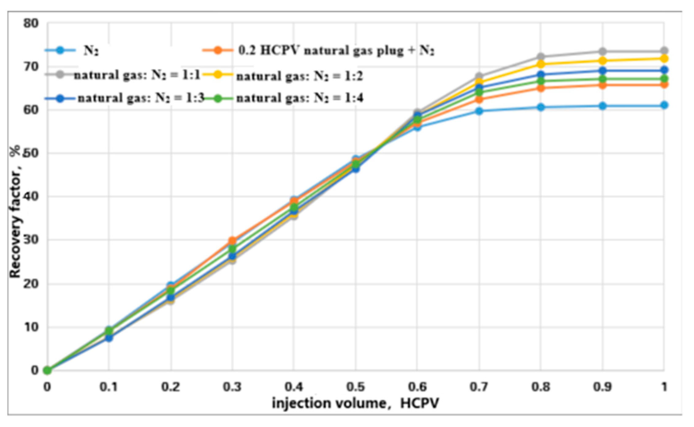 Nitrogen (Non-miscible) | ① In near-miscible state, the small volume coefficient is advantageous for energy supplementation; ② The on-site preparation of nitrogen and injection technology is well-develop; ③ Inert gas, with low operational risk. | The cost of dispersed gas injection is high, and there are corrosion issues with the tubing. |