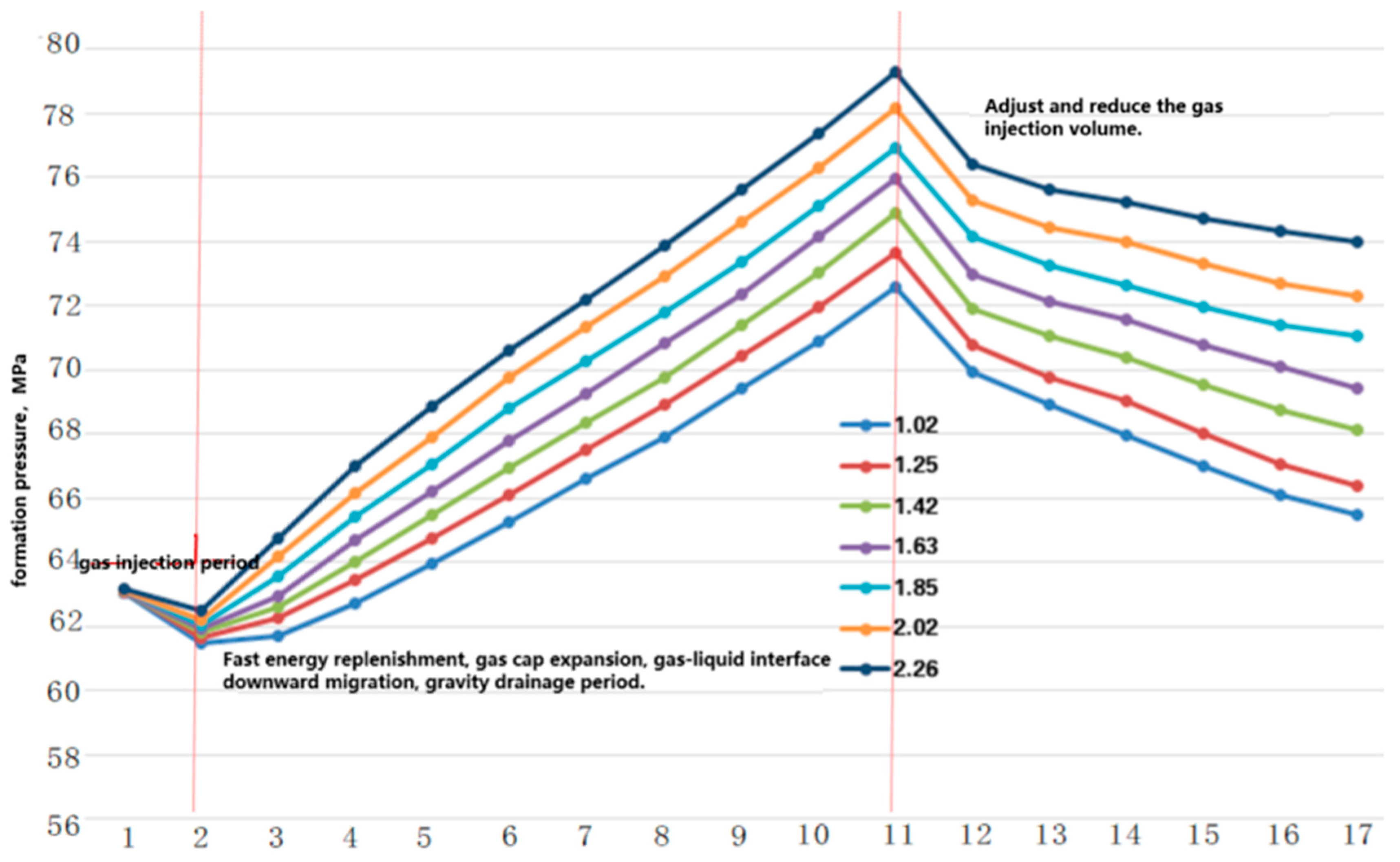 - Feng, Y.X.; Wang, X.C.; Yuan, X.M.; Lu, Z.Y.; Lu, Y.F. Optimal Design of Gas Injection and Recovery in Ultra-Deep Carbonate Reservoir-Taking Fuyuan 210 Block as an Example. In Proceedings of the International Field Exploration and Development Conference, Xi’an, China, 12–14 September 2024; Springer Nature: Singapore, 2024; pp. 973–987. [Google Scholar]
