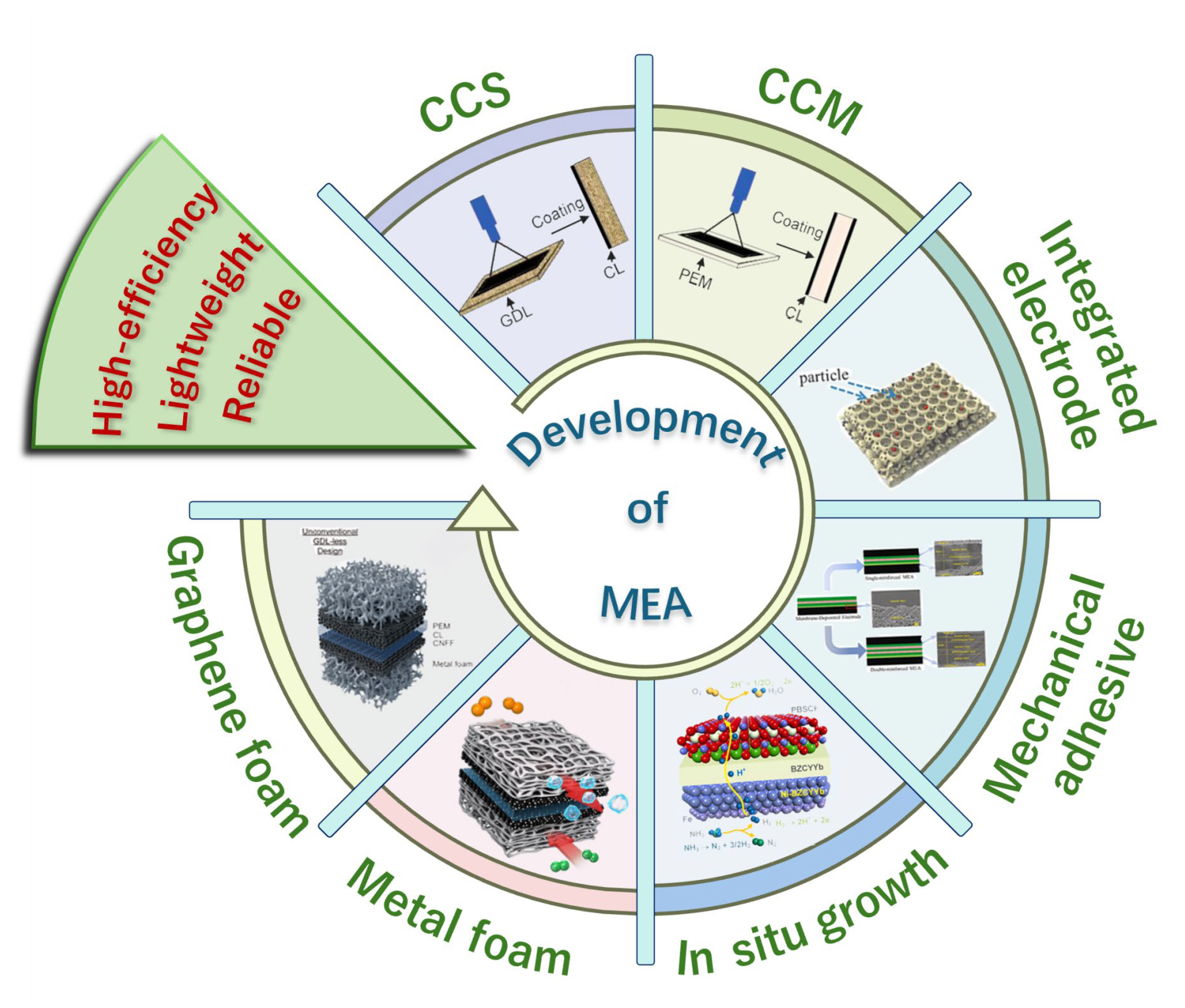 Integrated MEAs (membrane–electrode) | ePTFE reinforced wet-bonding MEA [15]; Mechanical-strengthened integrated PEMFC [16]; Inorganic LDH-based AEM MEA [18]; Catalyst intergrowth MEA for AEM electrolysis [19] | Wet-bonding ionomer + ePTFE reinforcement; direct deposition; LDH as ionic conductor; in-situ catalyst layer growth | PEMFCs: peak power ~1.0–1.5 W/cm2; AEM electrolysis: >1 A/cm2 at ~1.9 V | Strong interfacial bonding, reduced ohmic loss, improved durability | Process reproducibility, complex layer control, scale-up barriers |