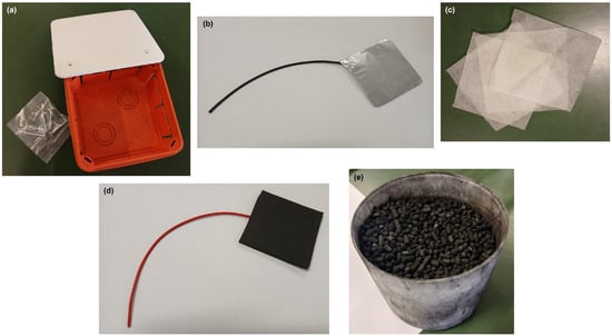 To evaluate the best layering setup, 48 MFCs were constructed, using 8 cm × 8 cm × 4 cm derivation boxes (Figure 2a) with the following stratification (from the bottom to the top of the cell): aluminum foil anode (Figure 2b), carbon pellets (when needed for the experimental setup) (Figure 2e), soil, polyethylene nonwoven fabric (Figure 2c), carbon felt cathode (Figure 2d), carbon pellets. The carbon felt cathodes measured 8 cm × 8 cm (surface area 64 cm2) and were approximately half a centimeter thick. The aluminum foil anodes measured 8 cm × 8 cm (surface area 64 cm2) and were approximately 2 mm thick. Carbon pellet layers were approximately 5 mm thick. Main technical data of carbon pellets are reported in Table 1. Nonwoven polyethylene fabric was used as a membrane due to its low cost and easy availability.