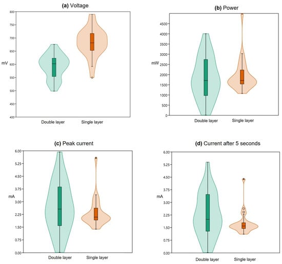 Violin plots (Figure 6) show “Single layer” “Control” group having higher median value in the distribution of voltage mean values (Figure 6a) and having a more compact distribution around the median value in peak current (Figure 6c), current after 5 s (Figure 6d), and power (Figure 6b) mean values than the “Double layer” “Control” group. Table 5 provides the minimum, maximum, and median values of the average distributions for the analyzed parameters.