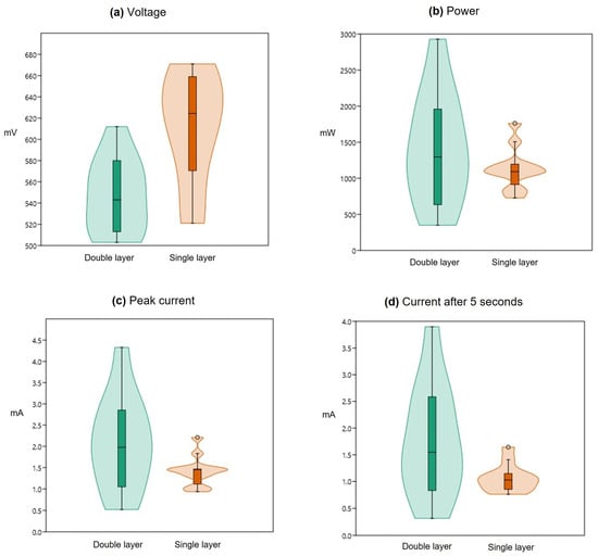 Distributions of the voltage mean values showed significant differences; the current values did not show significant differences between the groups, whereas the power values showed evidence of equality of the medians (Table 2). Violin plots (Figure 4) show “Single layer” group having higher median value in the distribution of voltage mean values (Figure 4a), and having a more compact distribution around the median value in peak current (Figure 4c), current after s5 s (Figure 4d), and power (Figure 4b) mean values distributions than “Double layer” group.