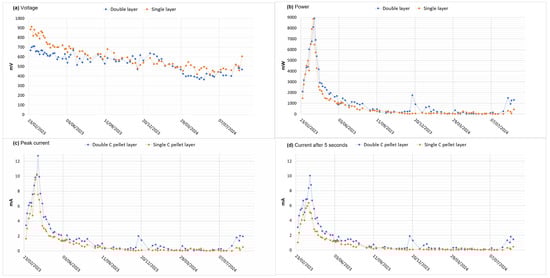 Comparison of group mean between “Double layer” and “Single layer” of carbon pellets from 28 February 2023 to 16 February 2024 (24 “Double layer” PMFCs vs. 24 “Single layer” PMFCs in one year) for each variable: (a) open circuit voltage, (b) power, (c) peak current, (d) current after 5 s.