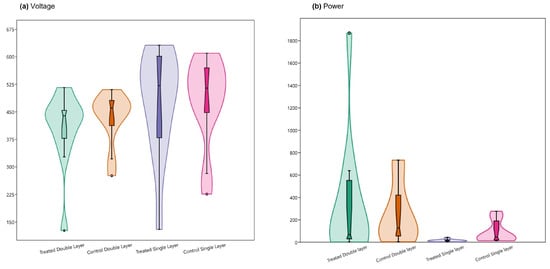 Violin and box plots comparing “Treatment Double layer”, “Control Double layer”, “Treatment Single layer”, and “Control Single layer” groups of PMFCs in terms of distribution of mean values for the variable: (a) voltage, (b) power.