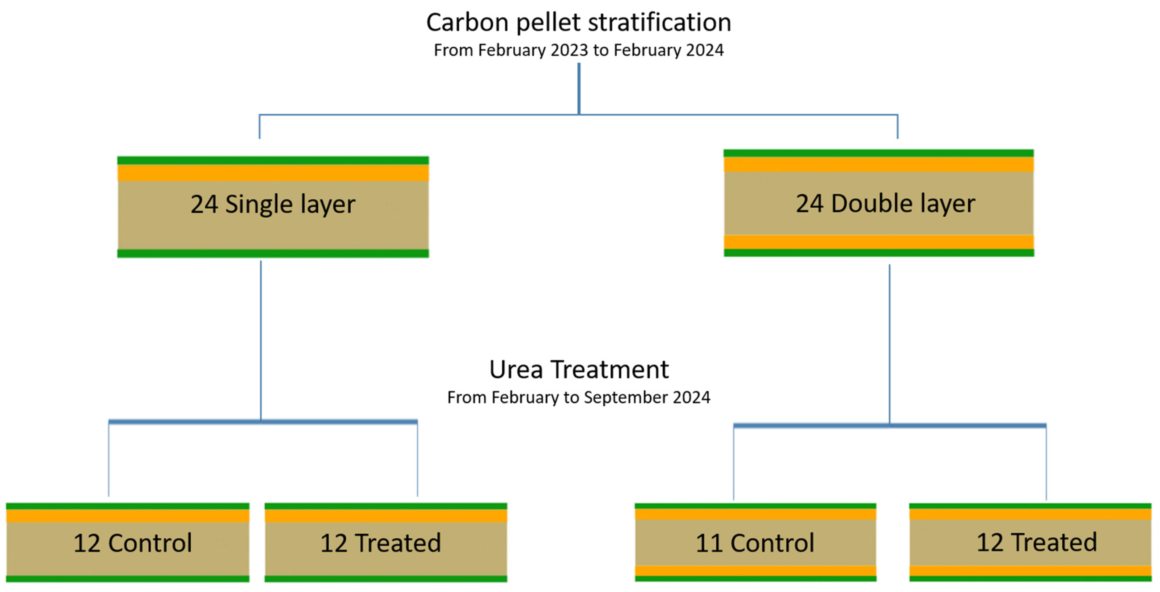 Summary of the results of carbon pellet stratification from Feb 2023 to Feb 2024 [p (same mean) when normal distributions were tested, p (same median) when non-normal distributions were tested, calculated using Montecarlo permutation]. Significantly different results are highlighted.