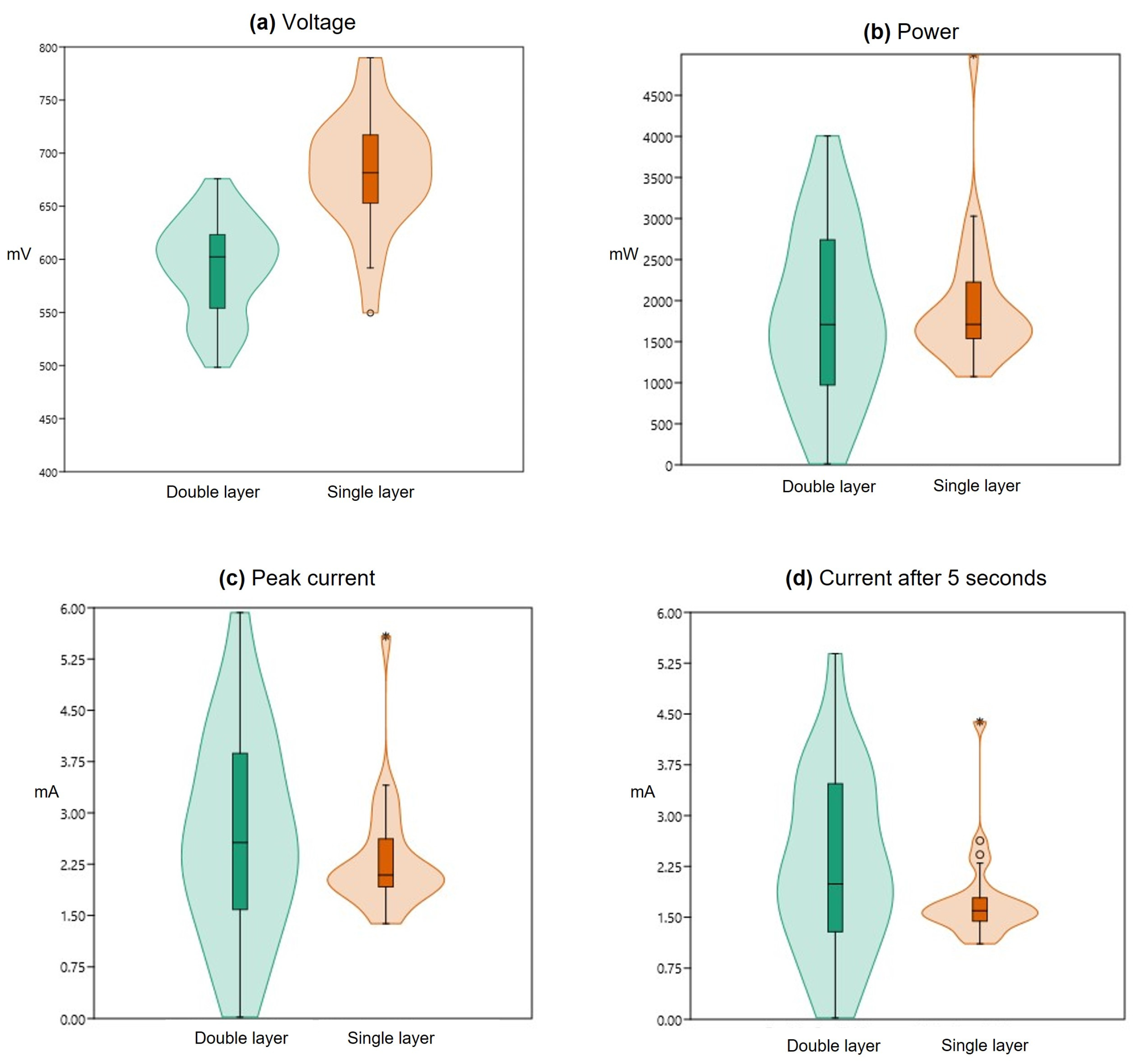 Violin and box plots comparing “Single layer” and “Double layer” “Control” groups in terms of distribution of PMFCs mean values for each variable: (a) voltage, (b) power, (c) peak current, (d) current after 5 s.