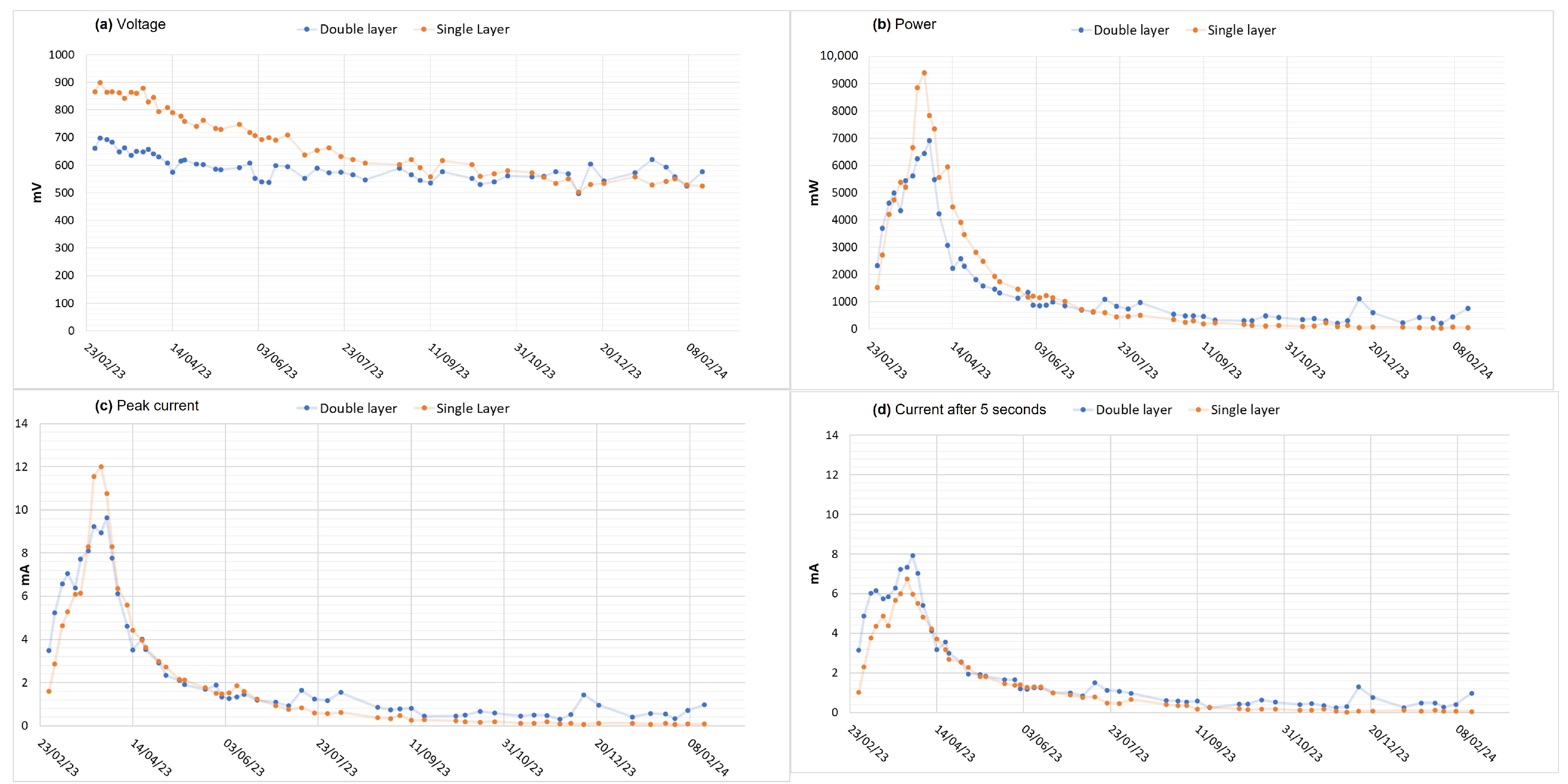 Comparison of group mean between “Double layer” and “Single layer” of carbon pellets from 28 February 2023 to 16 February 2024 (24 “Double layer” PMFCs vs. 24 “Single layer” PMFCs in one year) for each variable: (a) open circuit voltage, (b) power, (c) peak current, (d) current after 5 s.