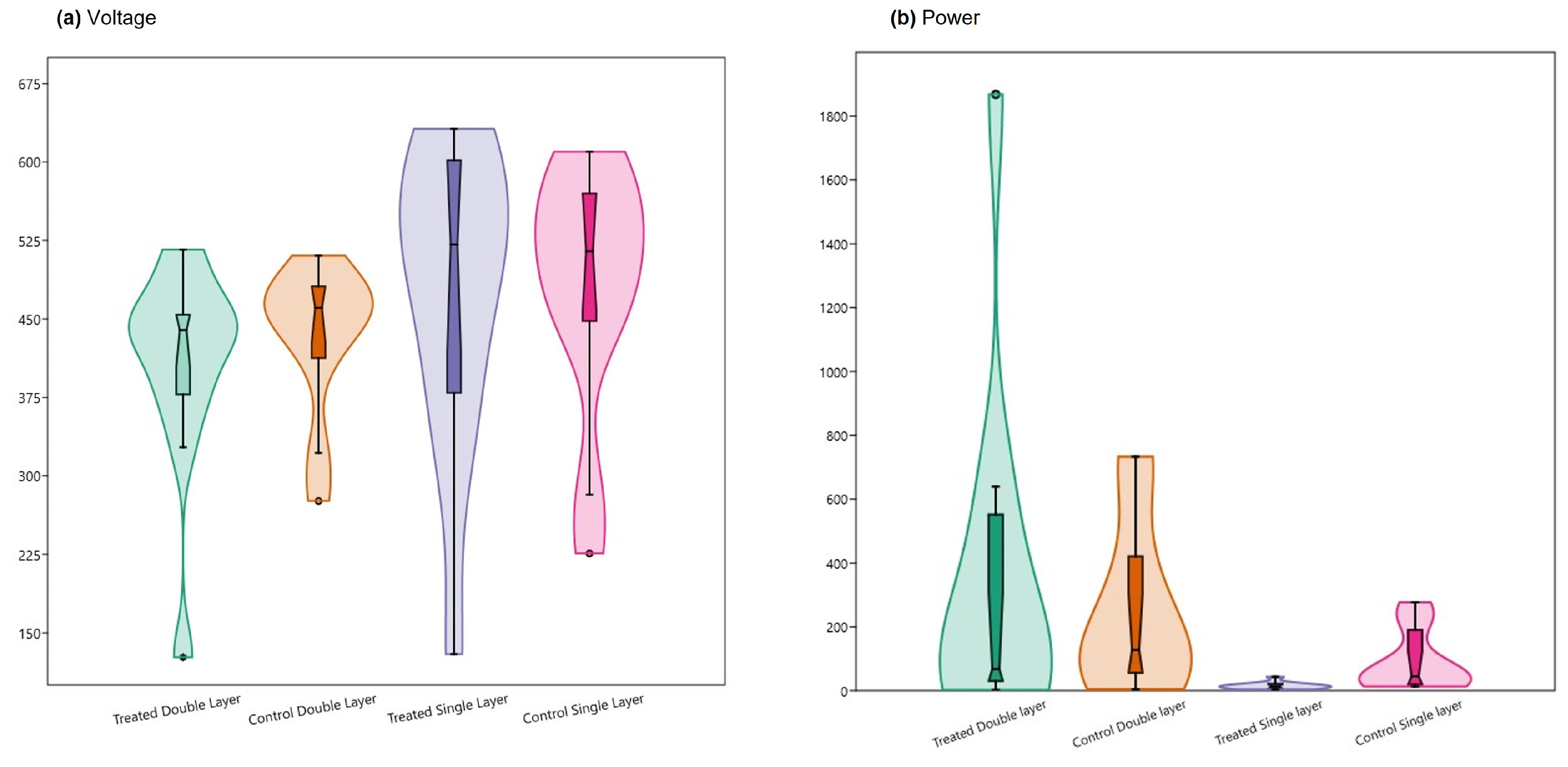 Violin and box plots comparing “Treatment Double layer”, “Control Double layer”, “Treatment Single layer”, and “Control Single layer” groups of PMFCs in terms of distribution of mean values for the variable: (a) voltage, (b) power.