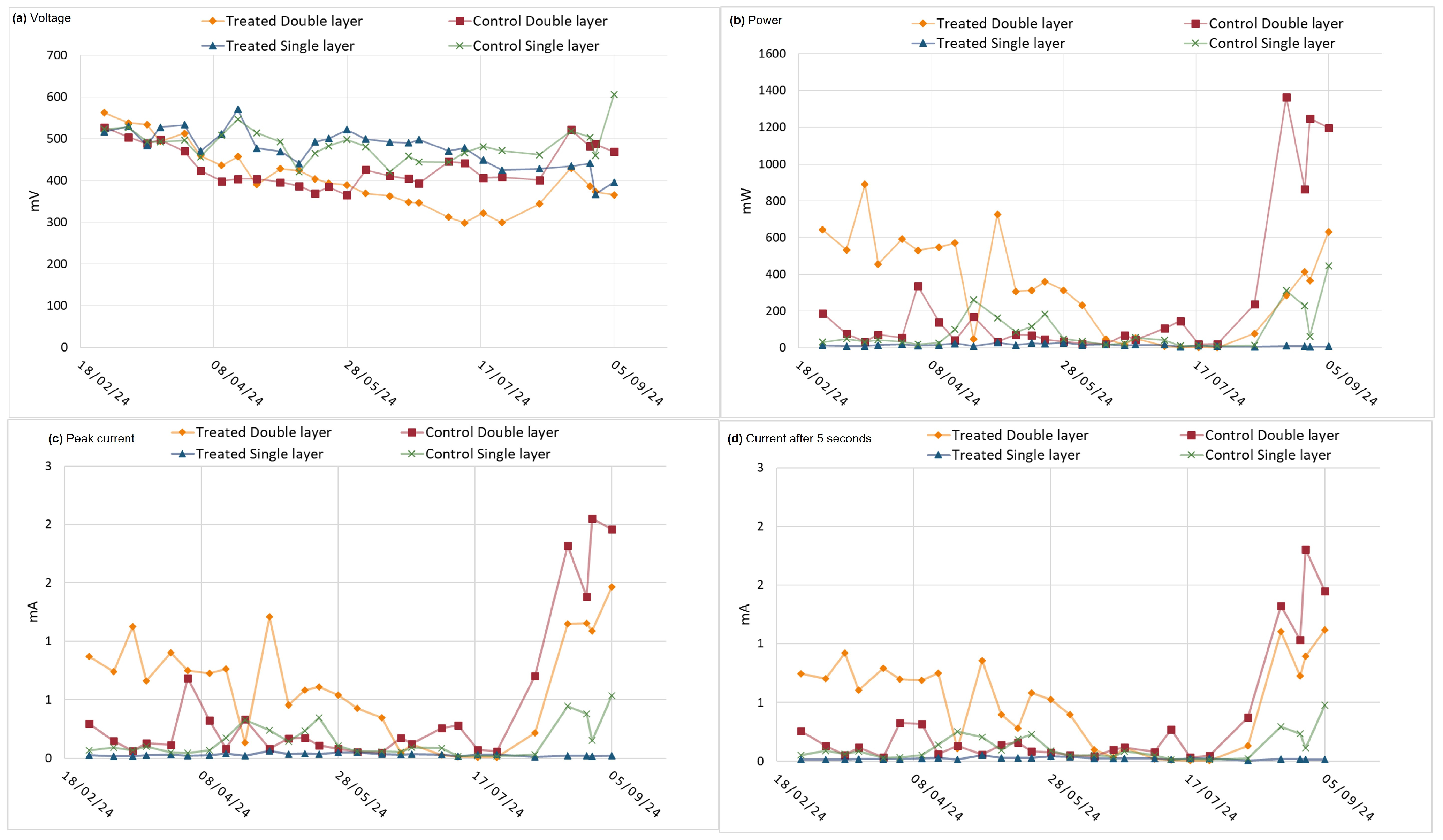 Comparison of sample averages between “Control Double layer” and “Control Single layer” groups from 28 March 2023 to 5 September 2024 (12 “Double layer” PMFCs vs. 12 “Single layer” PMFCs in one year and a half) for each variable: (a) open circuit voltage, (b) power, (c) peak current, (d) current after 5 s.