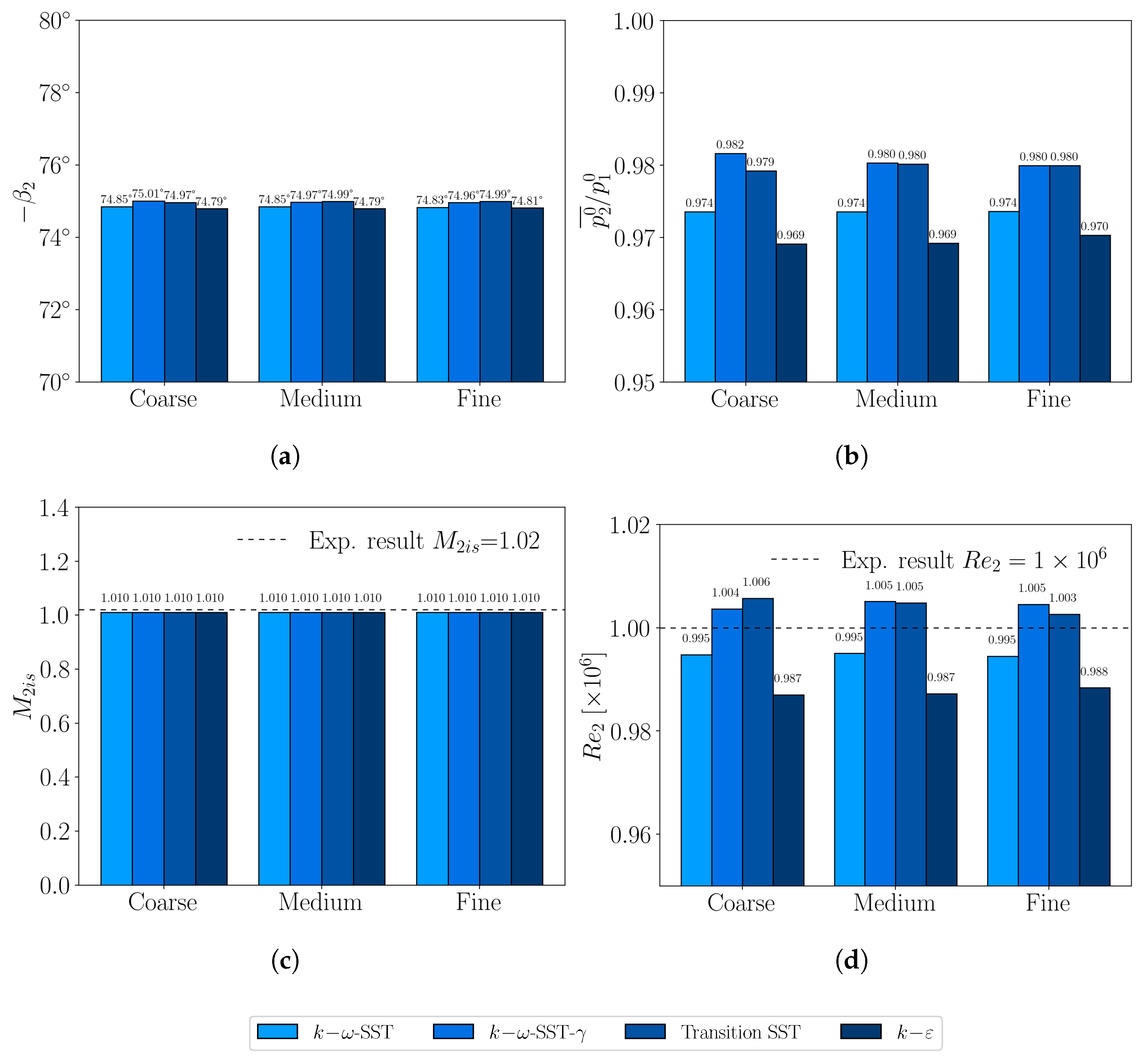 - A systematic mesh convergence analysis confirmed grid-independent solutions for global quantities, with near-exact agreement against experimental data for exit angle, outlet Mach number, and Reynolds number. Remaining discrepancies were primarily attributed to turbulence model dependence rather than discretization.