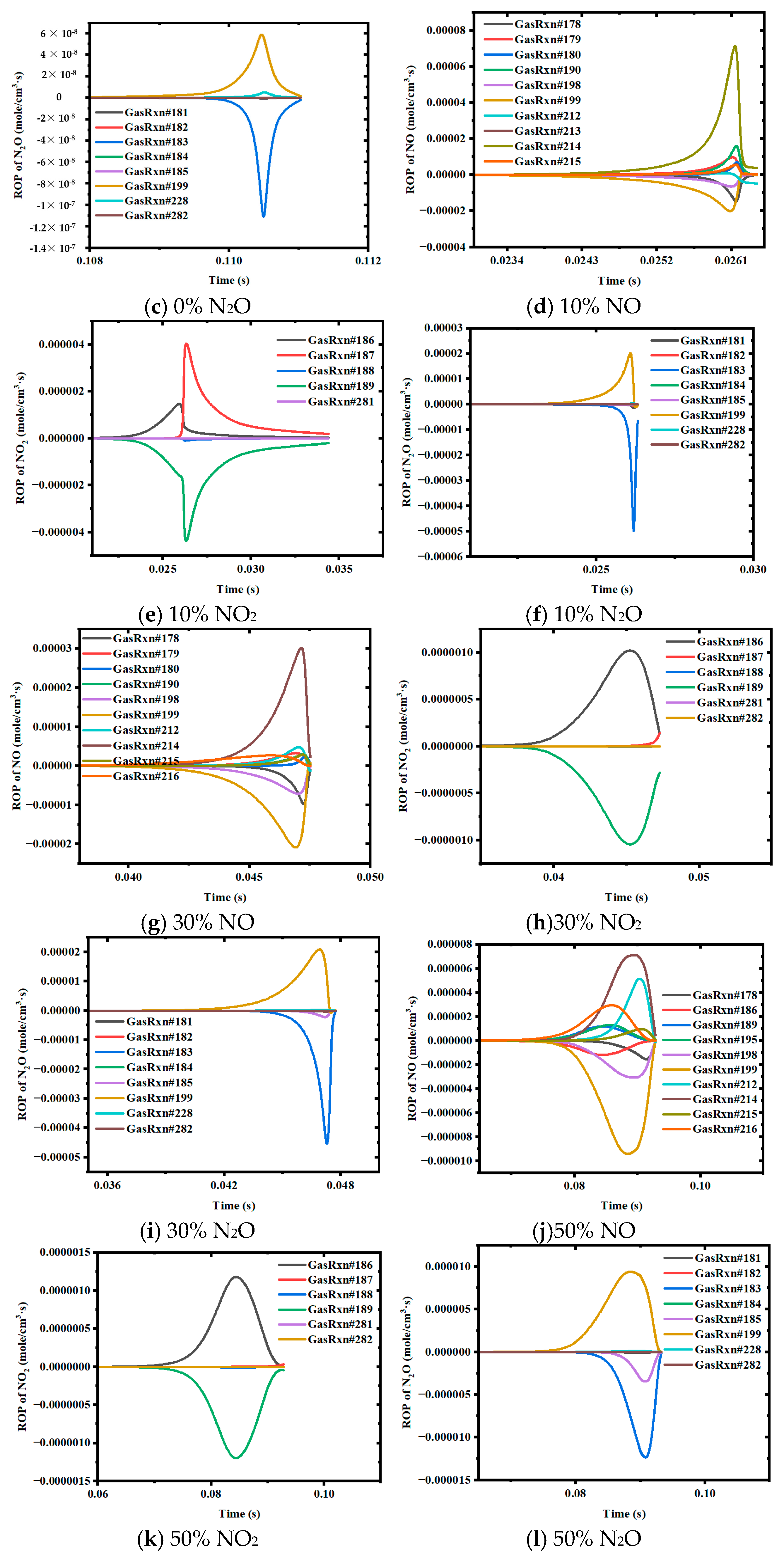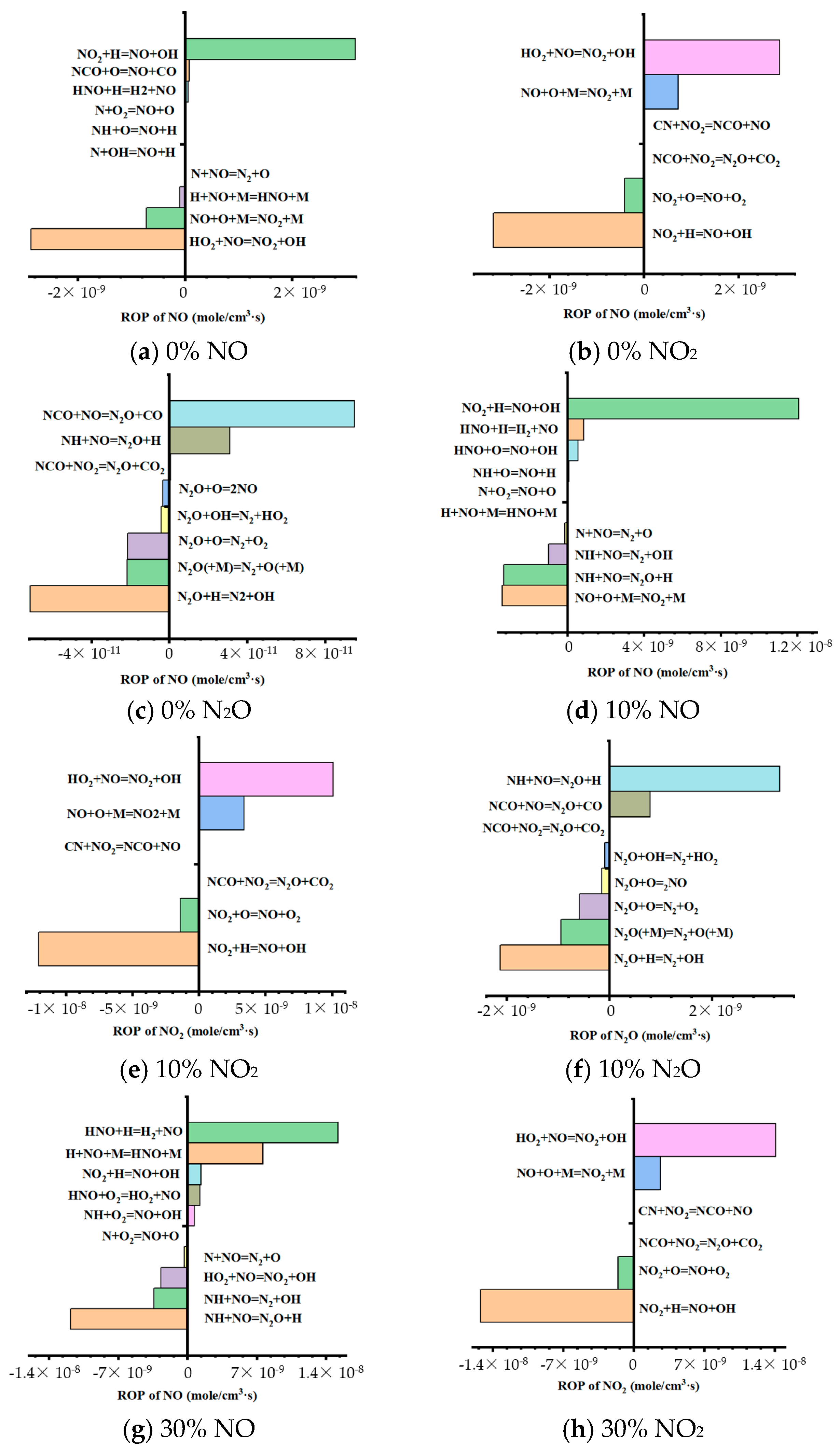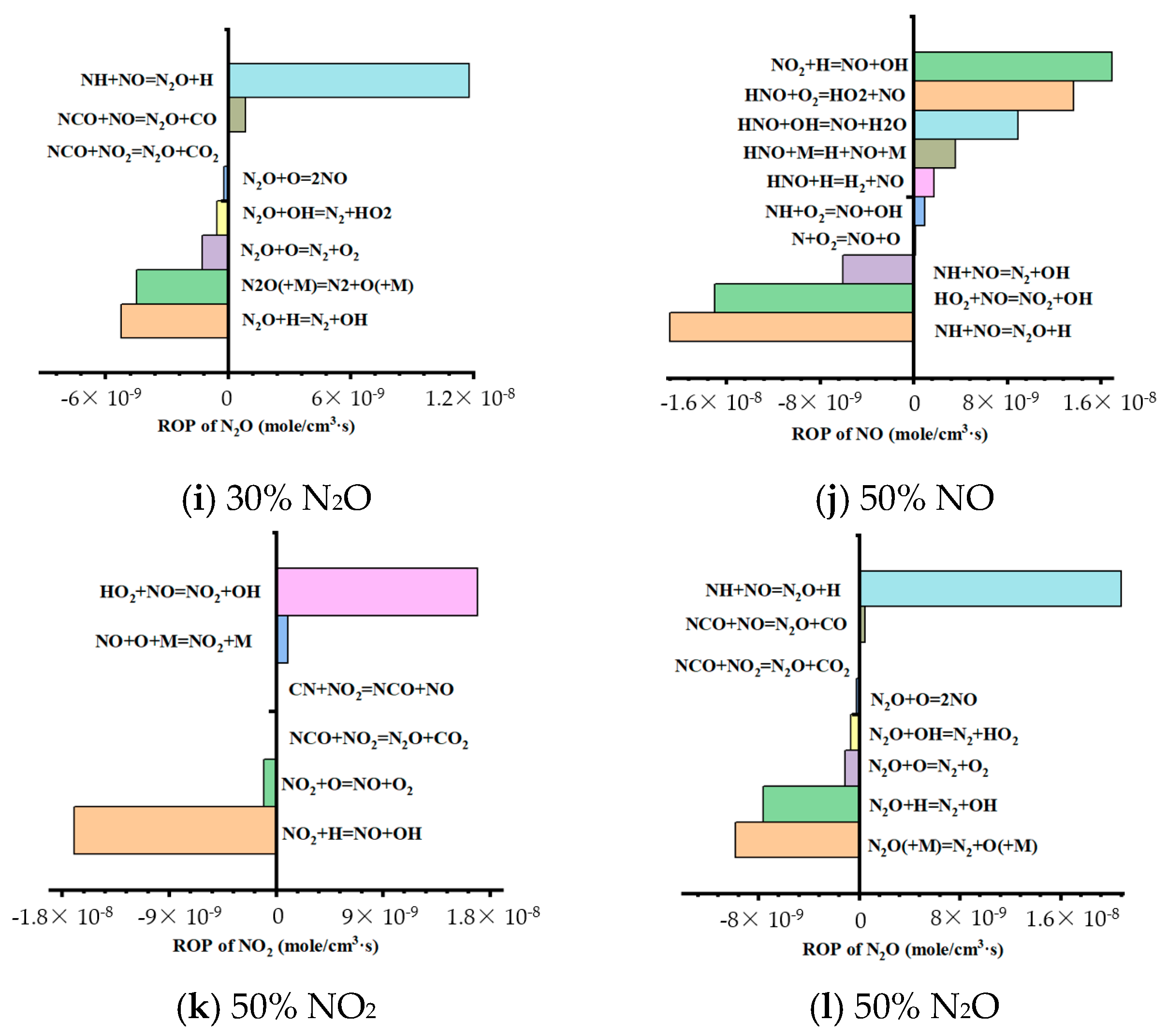 3.2. ROP Analysis of Ammonia–Coal Reaction Products Based on Closed 0D Homogeneous Reactor