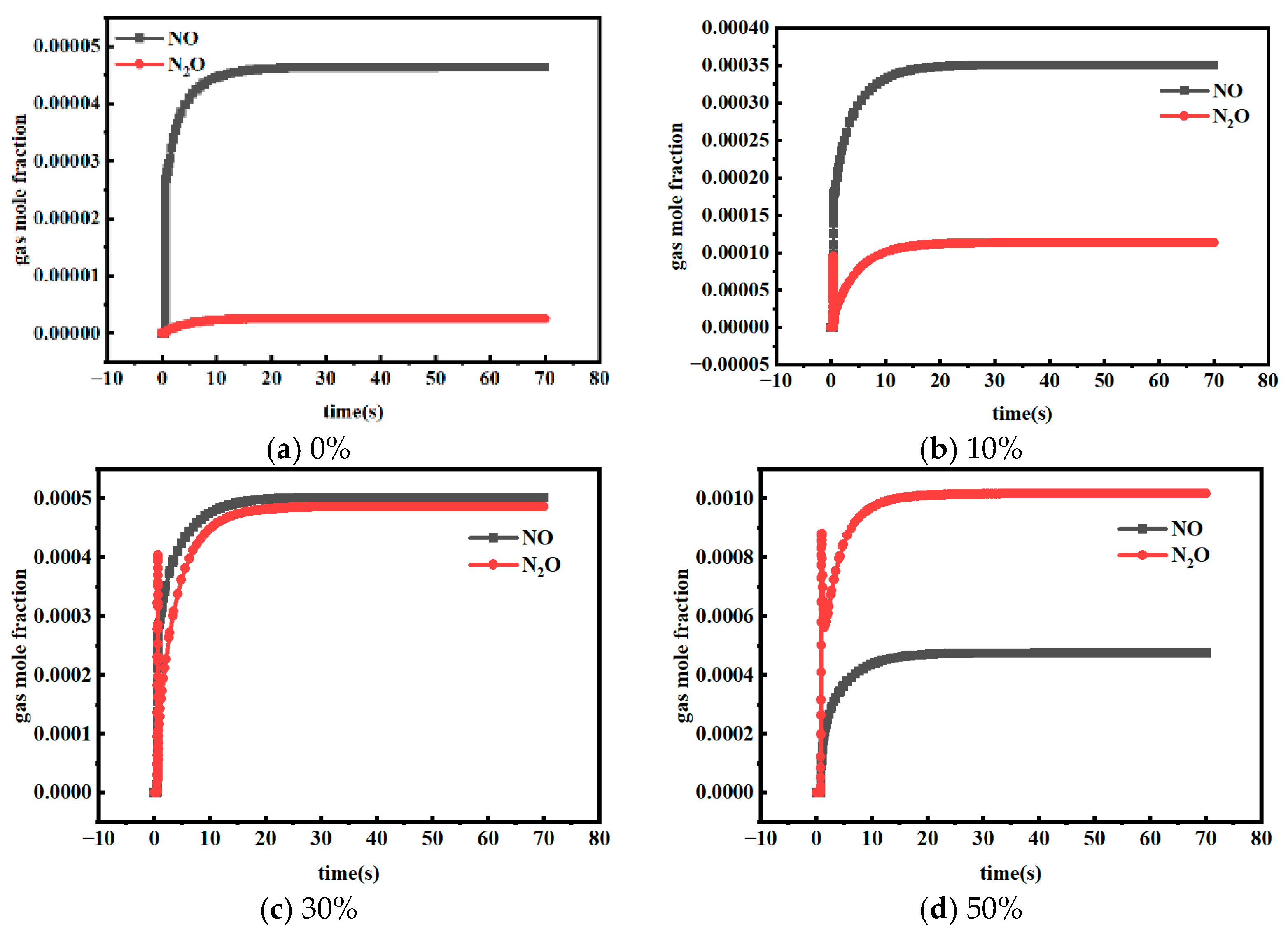 - The co-firing ratio shows a significant effect on the formation of NOx in the ammonia–coal co-firing processes. In the zero-dimensional homogeneous reaction process, with the increase in co-firing ratio, the molar concentrations of NO2 and N2O increase, whereas the molar concentration of NO increases first and then decreases. In the entrained flow reaction process, the total emission of NOx increases with the rise in co-firing ratio, where the stable emission concentration of NO increases first and then decreases, reaching the maximum at 30% co-firing ratio. However, the stable emission concentration of N2O continues to increase monotonously.